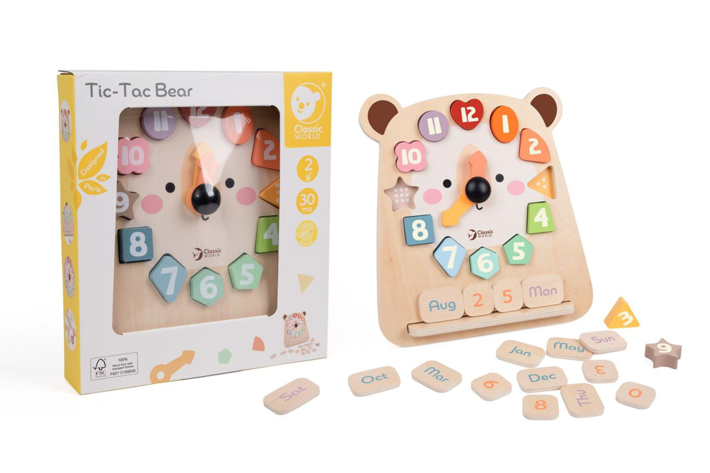 Roztomilé dřevěné hodiny s motivem medvěda pomáhají dětem zábavnou formou naučit se poznávat čas. Barevná vkládačka s čísly rozvíjí jemnou motoriku, logické myšlení i koordinaci ruky a oka. Otáčivé ručičky umožňují jednoduché procvičování hodin, zatímco jednotlivé dílky s čísly lze používat i samostatně při hře nebo počítání. Hračka je vyrobena z kvalitního dřeva a má veselý design, který zaujme každé dítě. Rozměry balení: 26 cm x 29 x 5cm Vhodné pro děti od 24 měsíců