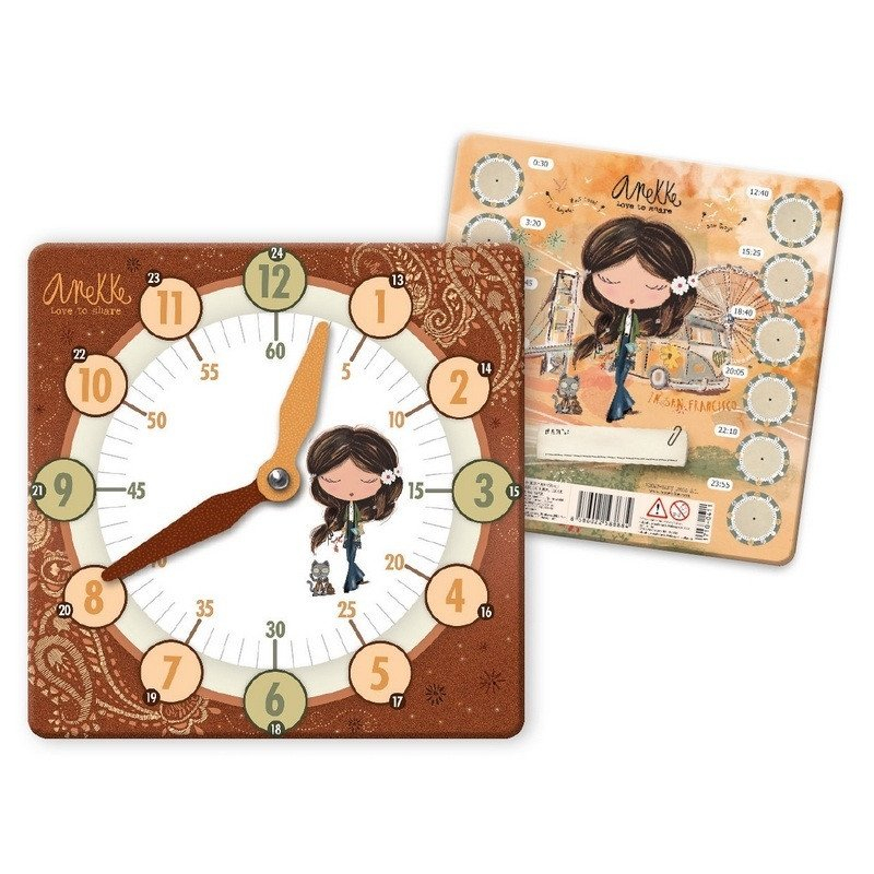 Papírové dětské hodiny na výuku s designem známého děvčátka Anekke z dílny španělské návrhářky. • obsahují ciferník se zvýrazněnými čísly 3, 6, 9 a 12 také čísla od 1 po 12 a minutové dělení s pohyblivými ručičkami • zadní strana hodinek slouží jako učební pomůcka, do které mohou děti zakreslovat čas, který dostanou za úkol