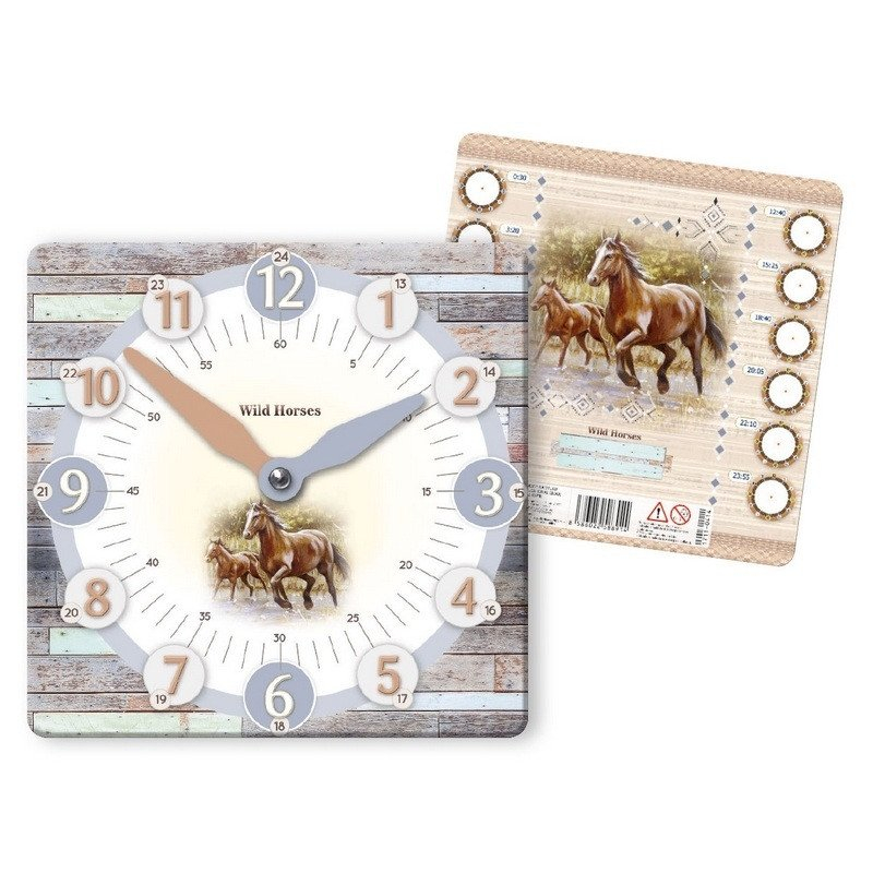Papírové dětské hodiny na výuku Wild horses. • obsahují ciferník se zvýrazněnými čísly 3, 6, 9 a 12 také čísla od 1 po 12 a minutové dělení s pohyblivými ručičkami • zadní strana hodinek slouží jako učební pomůcka, do které mohou děti zakreslovat čas, který dostanou za úkol