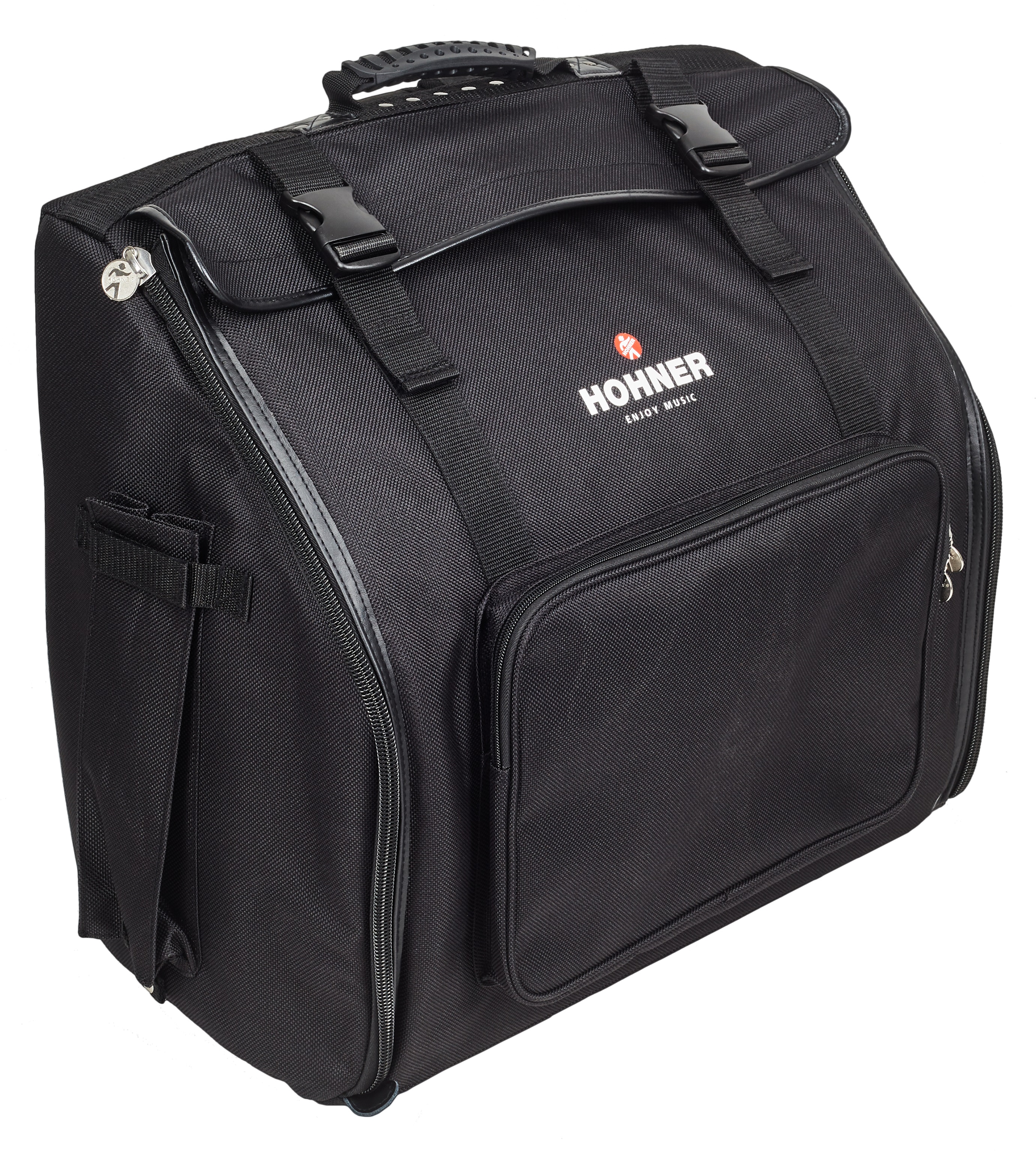 Pouzdro na akordeon Obaly na akordeon jsou určeny k snadné a rychlé manipulaci s nástroji. Gig bag od značky Hohner je vyroben z odolné umělé textilie Cordura s vnitřní vycpávkou a vyztužením, takže i v případě nenadálého nárazu nedojde k poškození akordeonu. Kapsa pro příslušenství, polstrované ergonomické popruhy a kvalitní zipy jsou samozřejmostí. Model XXL je vhodný pro nástroje se 120 basy.