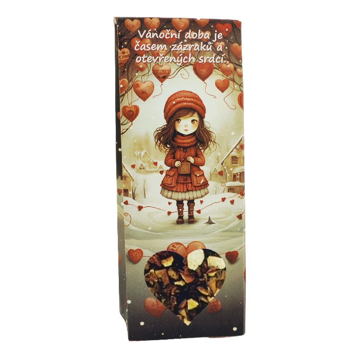 Směs ořechů a sušeného ovoce v dárkové krabičce s motivem holčičky se srdíčky. Text: Vánoční doba je časem zázraků a otevřených srdcí. Složení: jádra lískových ořechů, mandle loupané, papája, rozinky Alergeny: mandle, lískové ořechy, SO2 Může obsahovat stopy jiných skořápkových plodů.