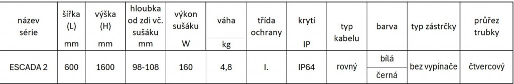 Elektrický sušák ručníků ESCADA 2 je moderní a prostorově úsporné řešení s hloubkou pouhých 10 cm. Nabízí možnost montáže na zeď nebo opření o zeď s fixací horními úchyty. Je vyroben z čtvercových profilů a v bílé i černé variantě má barevně sladěné všechny detaily včetně kabelu a zástrčky. Lze jej doplnit o poličku nebo věšák na ručníky.Elektrický sušák ručníků ESCADA 2 je ideálním řešením pro moderní interiéry. Díky hloubce pouhých 10 cm působí subtilně a elegantně i v menších koupelnách. V bílé i černé variantě je barevně sladěn do posledního detailu – nejen trubky a uchycení, ale také napájecí kabel a elektrická zástrčka. Elektrický sušák udržuje přes den ručníky, utěrky a osušky svěží. Jeho užitné vlastnosti vyniknou zejména v době mimo topné sezóny. Konstrukce sušáku umožňuje jeho stálé zapojení do sítě. Zahřátí na užitnou teplotu trvá cca 15 minut. Povrchová provozní teplota je cca 45°C. Dvojitá izolace, odolnost proti tryskající vodě - krytí IP 64. U každého modelu Escada Electro je spínač zabudován v zadní části trubky kolem horní části sušáku. Není tedy vidět zepředu ani z boku. Nízká spotřeba el. energie. Uvnitř sušáku je pouze odporový drát, tudíž není třeba ho napouštět žádnou plnící tekutinou. Sušák lze instalovat dvěma způsoby: připevnit na zeď jako závěsný model, opřít o zeď a zajistit horními úchyty. Rozměrové varianty: 600 × 1600 mm, 160W Materiál: provedení boční ocelová trubka o rozměrech 30x30 mm, středová 20x20 mm - hranaté trubky povrchová ochrana je provedena práškovou barvou za horka (komaxit) Barevné provedení: C31 černá matná C34 bílá matná ZÁRUKA 15 LET