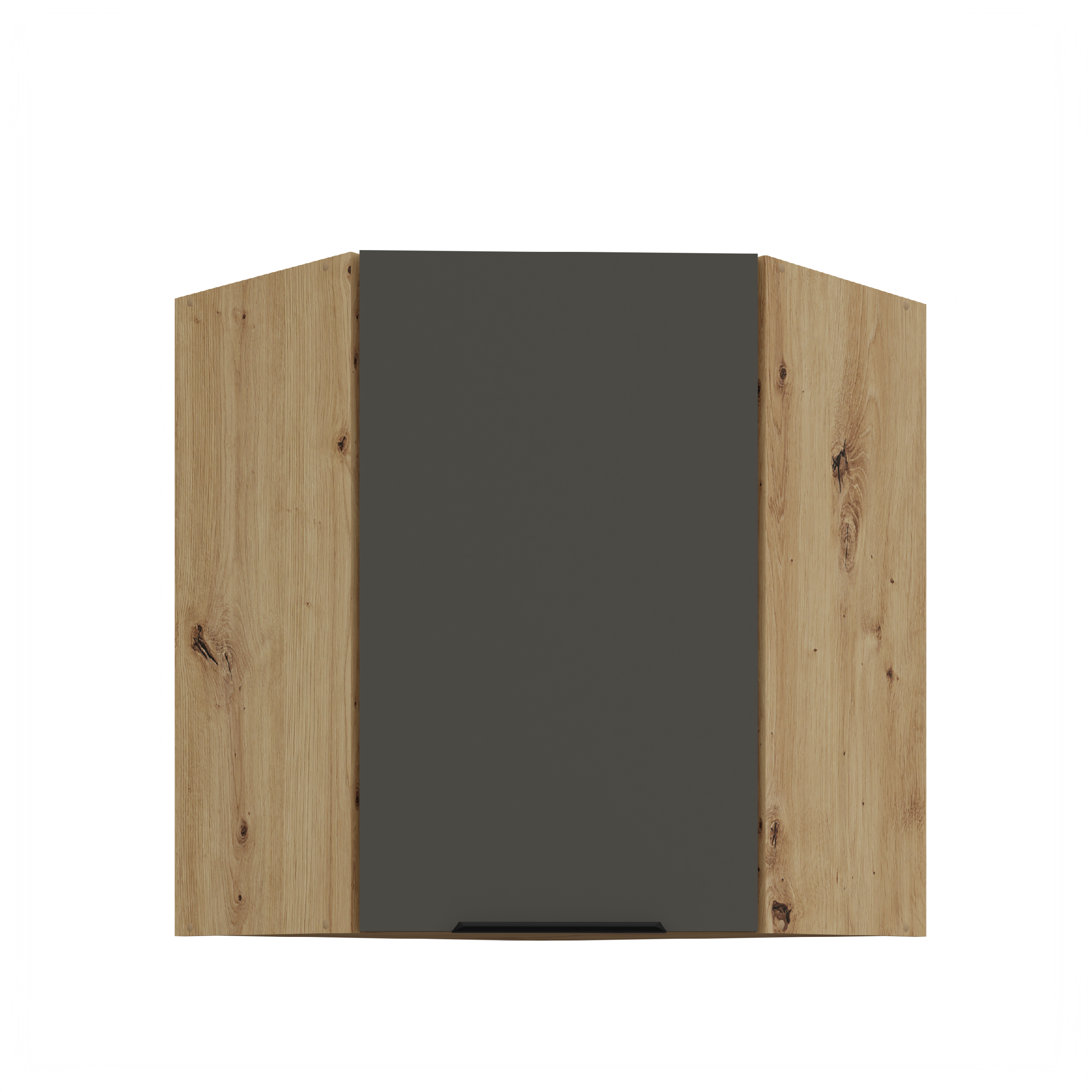 Horní rohová skříňka Aria 60x60 GN-72 1F (45°) Vlastnosti: Materiál Laminovaná dřevotřísková deska o síle 16 mm Zakončené hrany ABS hrana o síle 1 mm Anti Finger Print Jedná se o speciální povrchovou úpravu, kdy na povrchu dvířek / čel zásuvek nezůstávají otisky prstů. Úchyt Matný kovový černý úchyt Vnitřní barva Vnitřek skříně je bílý Vnitřní uspořádání Dvě police Panty / Pojezdy Panty s tlumeným zavíráním • Barevné kombinace K dispozici je celkem 15 barevný kombinací - 3 barevné varianty korpusu a 5 barevných variant dvířek. Dub artisan korpus Bílá matná korpus Černá matná korpus BL - Black AFM dvířka / čela zásuvek SA - Aquamarine AFM dvířka / čela zásuvek TA - Sandgrau AFM dvířka / čela zásuvek GR - Graphite AFM dvířka / čela zásuvek WH - Crystal white AFM dvířka / čela zásuvek • Rozměry:Šířka:60x60 cmVýška:71,5 cmHloubka:31 cmPočet balení:2 krabice • Odkazy na příslušenství ke kuchyňským linkámKompletní nabídka skříněk ke kuchyňské lince AriaPracovní deskyPříslušenství ke kuchyním •