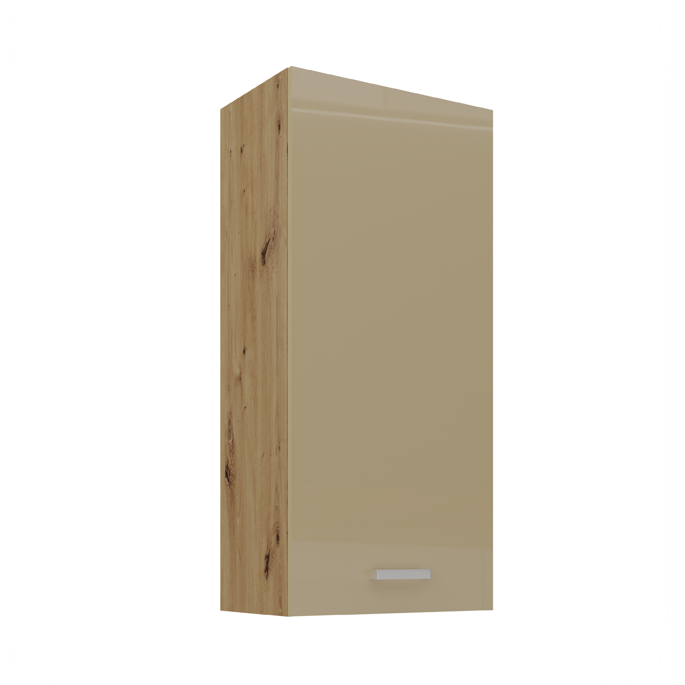 Horní skříňka Artisan 50 G-108 1F Vlastnosti: Materiál Laminovaná dřevotřísková deska o síle 16 mm a PUR HG deska 16 mm Zakončené hrany ABS hrana o síle 1 mm Úchyt Matný kovový stříbrný úchyt Vnitřní barva Vnitřek skříně je bílý Vnitřní uspořádání Tři police Panty / Pojezdy Panty s tlumeným zavíráním • Barevné kombinace Dub artisan a bílý lesk Korpus je v dřevěném dekoru, dvířka v kombinaci dřeva a bílého lesku Dub artisan a cappucino lesk Korpus je v dřevěném dekoru, dvířka v kombinaci dřeva a lesklého cappucina • Rozměry:Šířka:50 cmVýška:108 cmHloubka:31 cmPočet balení:2 krabice • Odkazy na příslušenství ke kuchyňským linkámKompletní nabídka skříněk ke kuchyňské lince ArtisanPracovní deskyPříslušenství ke kuchyním •