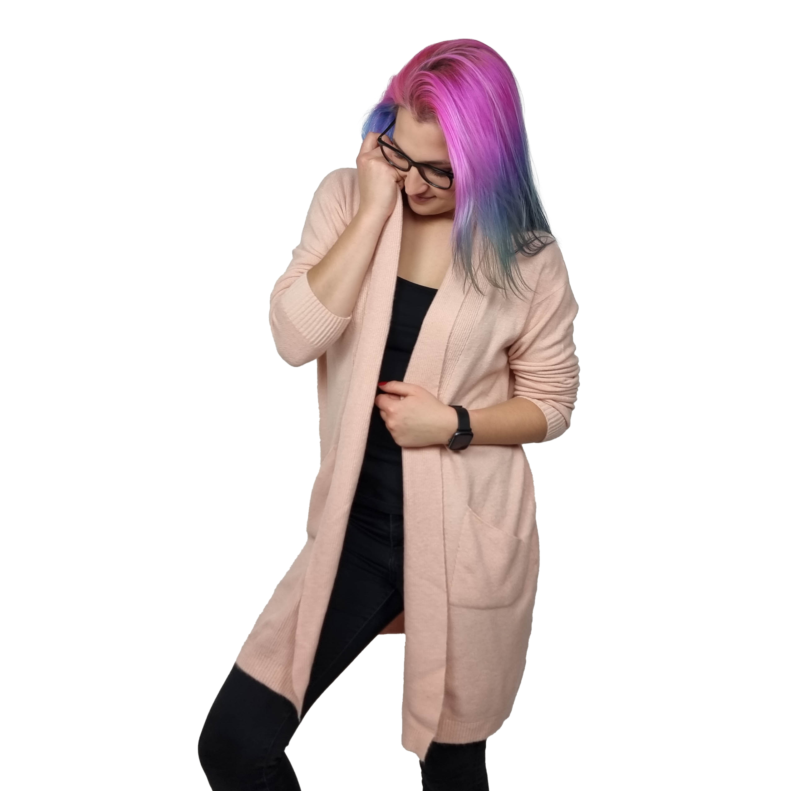 Dámský stylový jednobarevný kardigan ve střední délce. Kardigan je z velice příjemného materiálu. Vhodný do přechodného období.