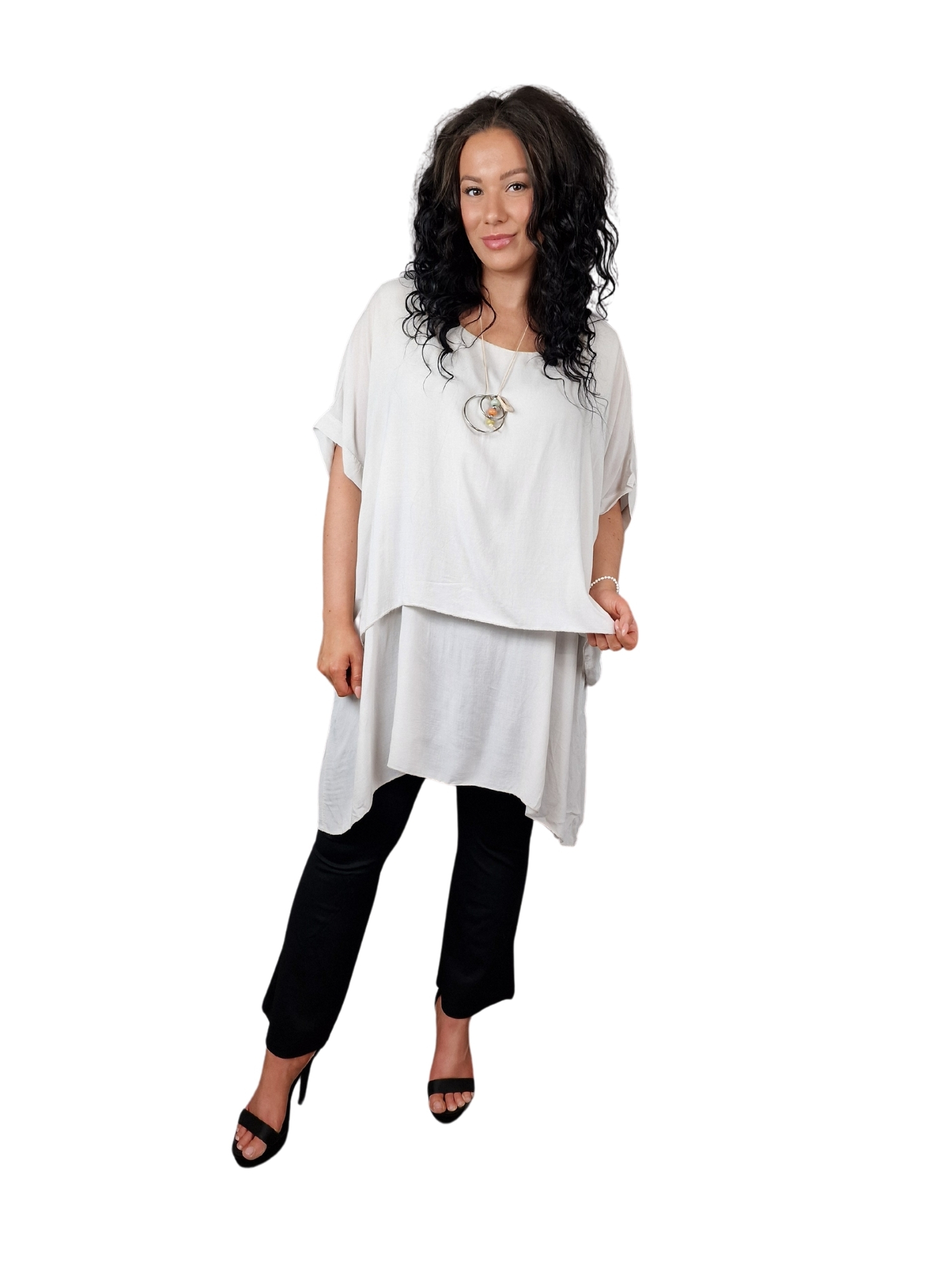 Délka halenky sahá po stehna, což jí dodává moderní a mladistvý vzhled. Tato délka je zároveň velmi praktická, protože halenka může být nošena jak s kalhotami, tak i s legínami.