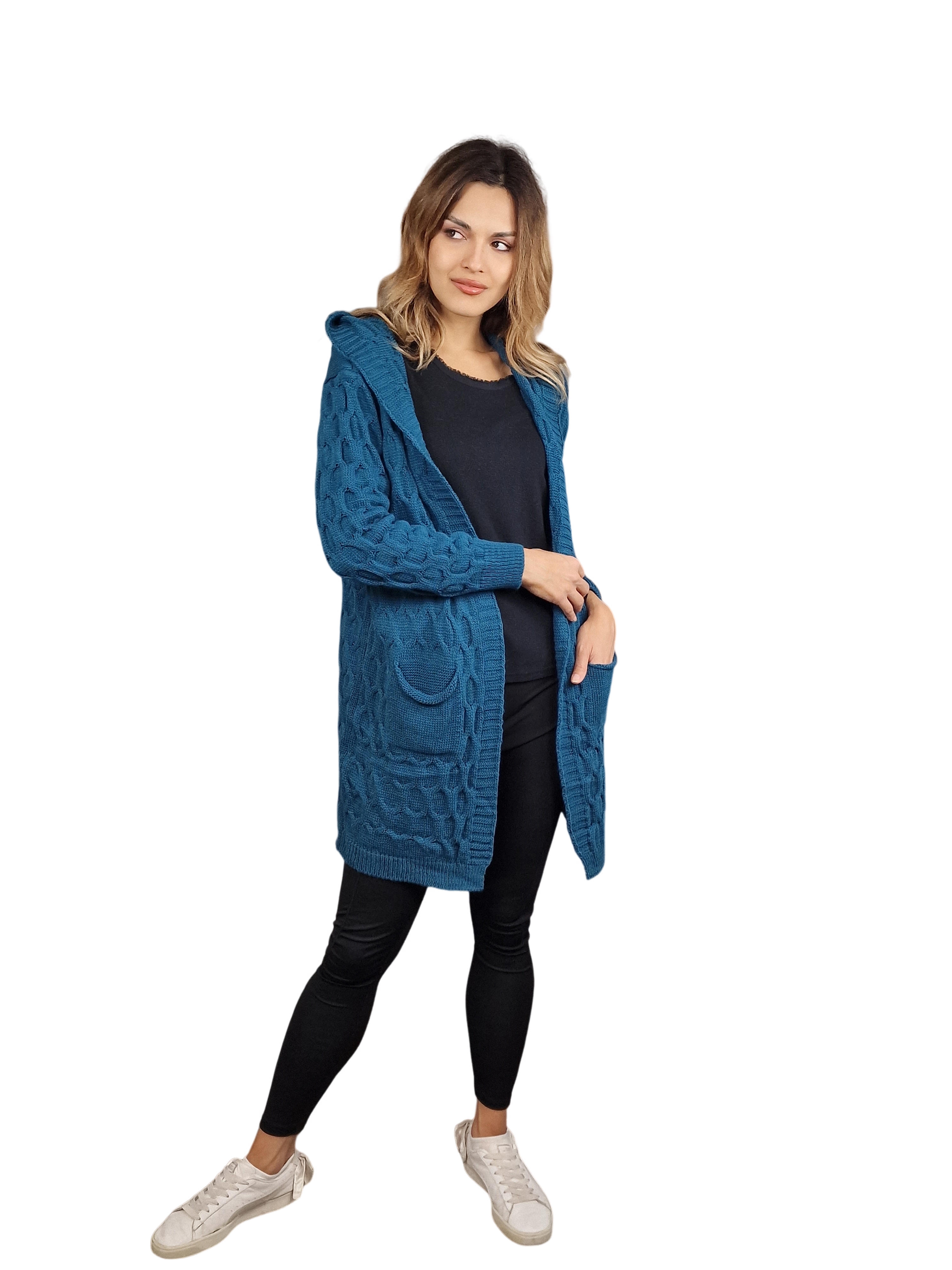 Kardigan Lee je kabelový svetr jednobarevný s kapsami a kapucí. Tento svetr je nejen teplý a pohodlný, ale také stylový a nadčasový. Vytvořen z kvalitního materiálu, poskytuje maximální pohodlí a ochranu před chladným počasím. Jeho jedinečný design s kabelovým vzorem dodává svetru na eleganci a vynikajícím vzhledu. Díky kapsám budete mít všechny důležité věci stále po ruce. Kapuce pak zajišťuje další vrstvu ochrany proti větru a chladu. Kardigan Lee je ideální volbou pro každodenní nošení i pro speciální příležitosti. Přidejte tento stylový kousíček do svého šatníku a užijte si pohodlí a eleganci na každém kroku.