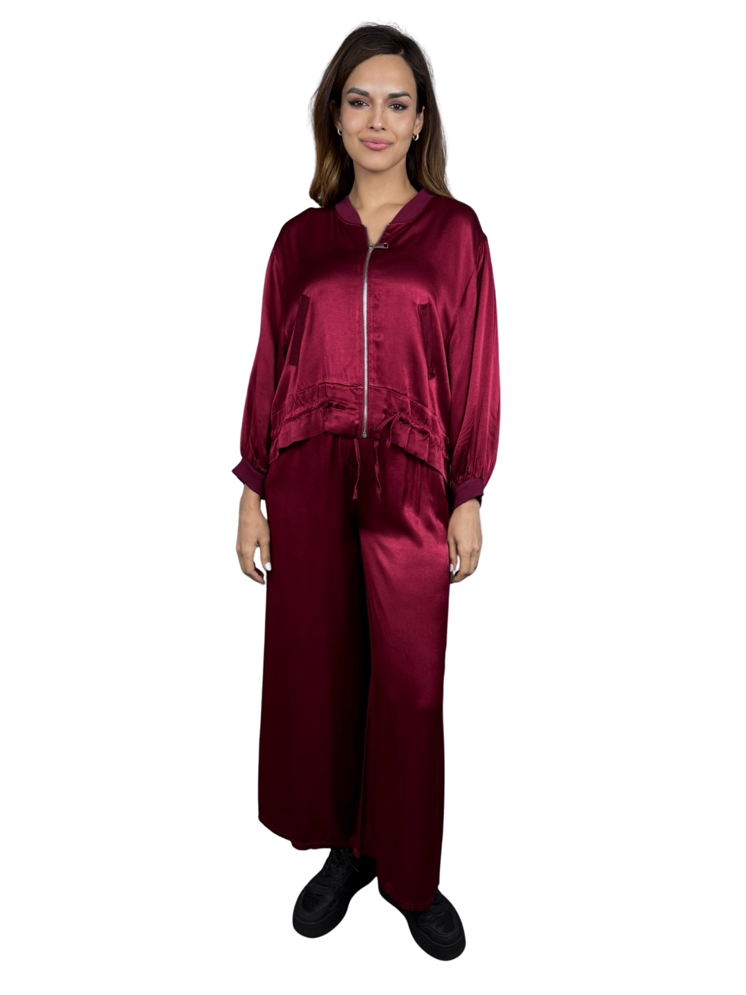 Komplet Solenne propojuje lehkost a eleganci v setu, který vynikne na den i večer. Bunda ve stylu bomber se zipem, stahováním v pase a kapsami působí sportovně-šik, zatímco široké palazzo kalhoty dodají outfitu vzdušnost a pohodlí.