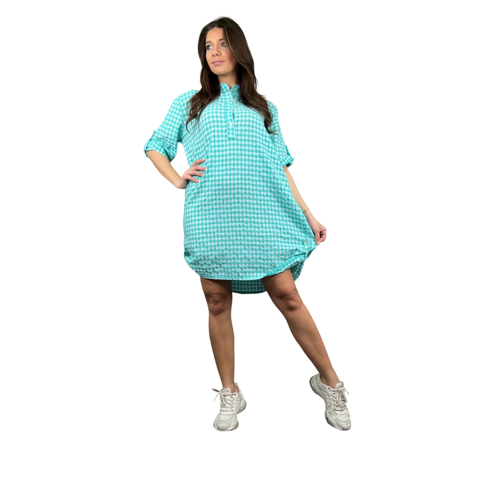 Dámské krepová, oversize košile s knoflíky. Košile je kostkovaná a se třemi knoflíky a límečkem. Košili je možné nosit také jako šaty.