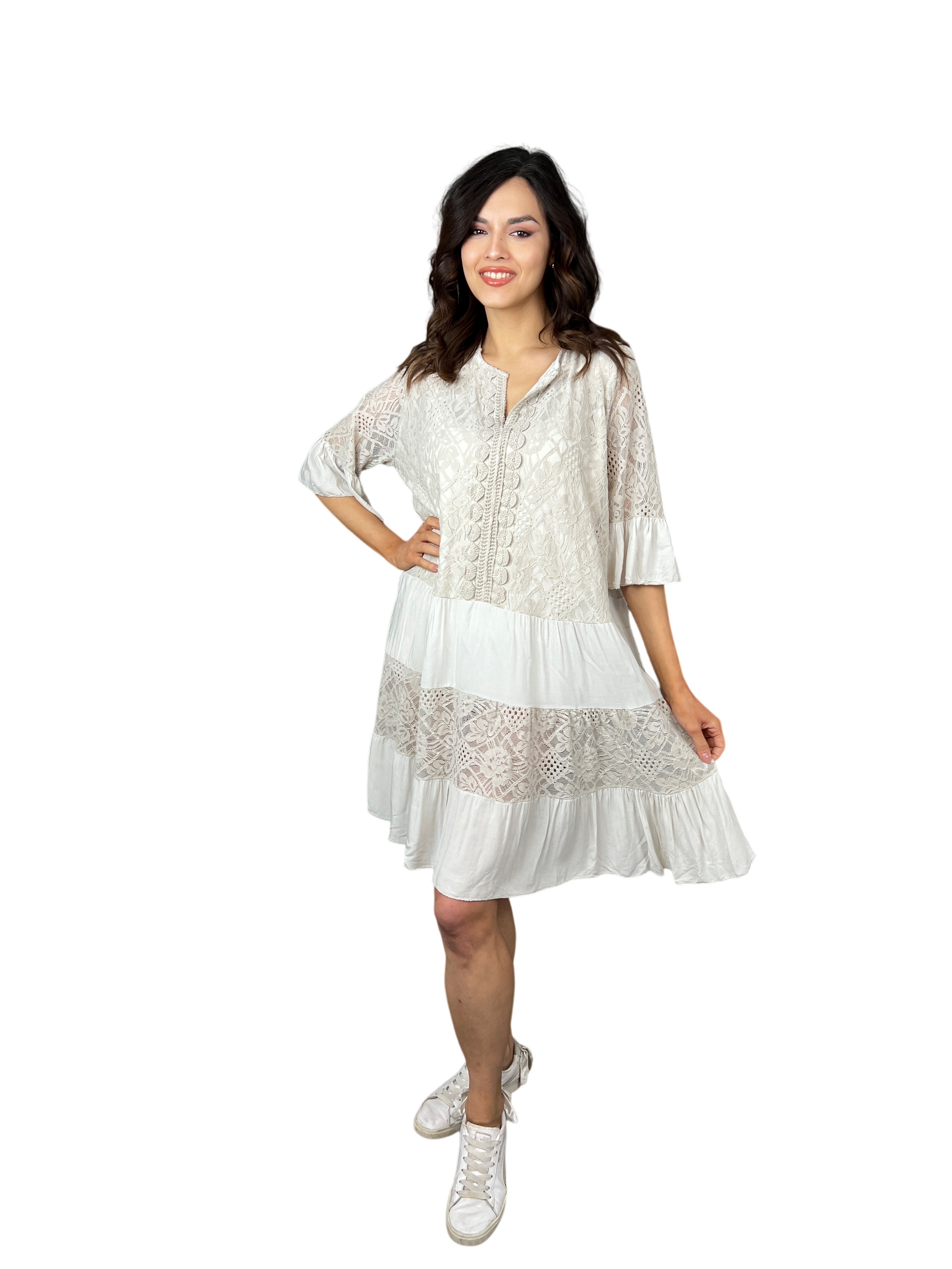Hlavním prvkem designu těchto šatů je krajkový detail. Krajkové aplikace přidávají šatům jemnost, eleganci a romantiku. Můžou se vyskytovat na rukávech, výstřihu nebo spodním lemu šatů, přičemž vytvářejí efektní kontrast s viskózovým materiálem.