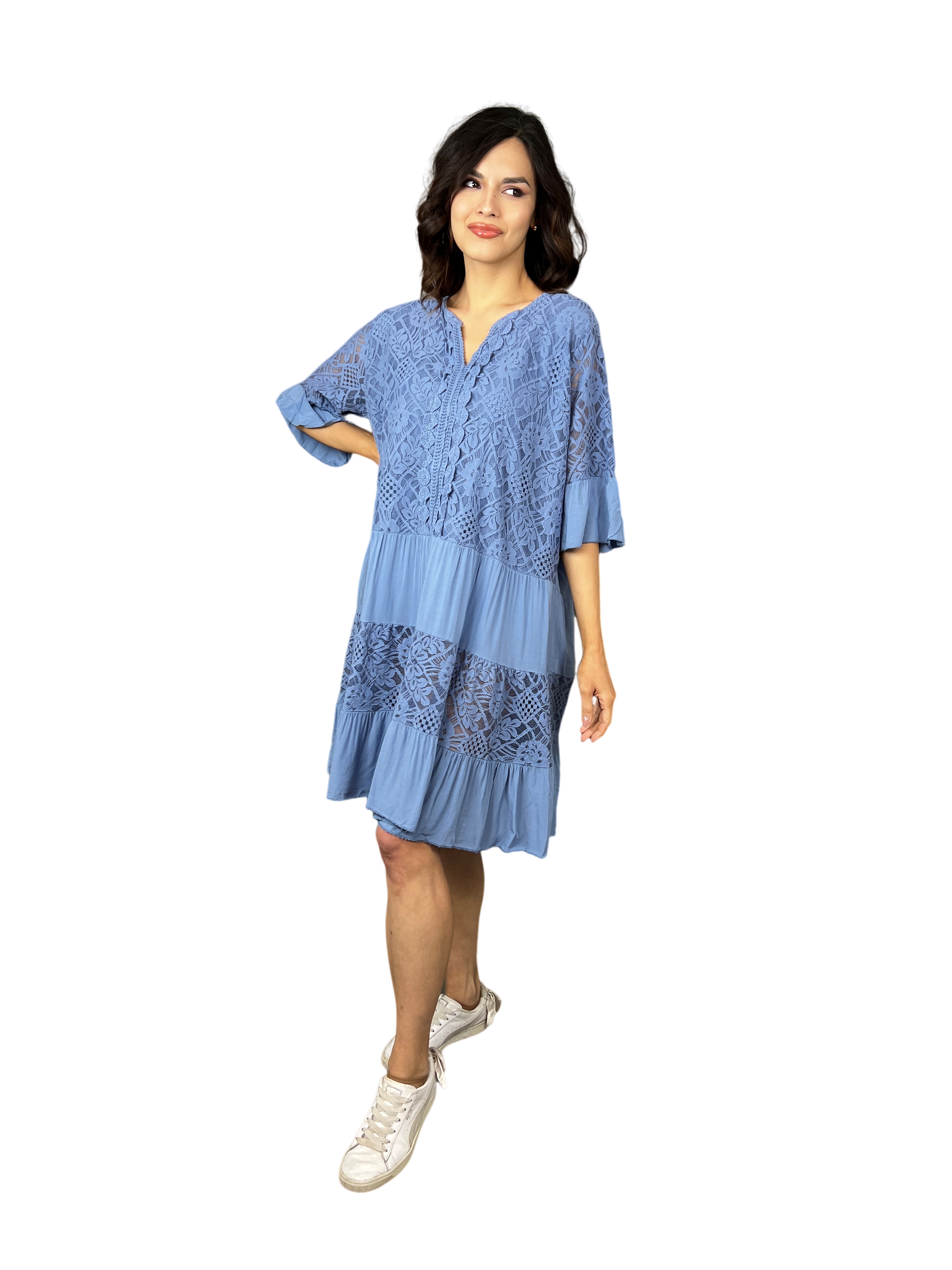 Krajkové šaty Caelia jsou vyrobeny z luxusního viskózového materiálu, který je známý svou měkkostí, příjemným pocitem na pokožce a schopností dobře padnout. Tento materiál je také prodyšný, což zajišťuje, že se budete cítit pohodlně i v teplejším počasí.