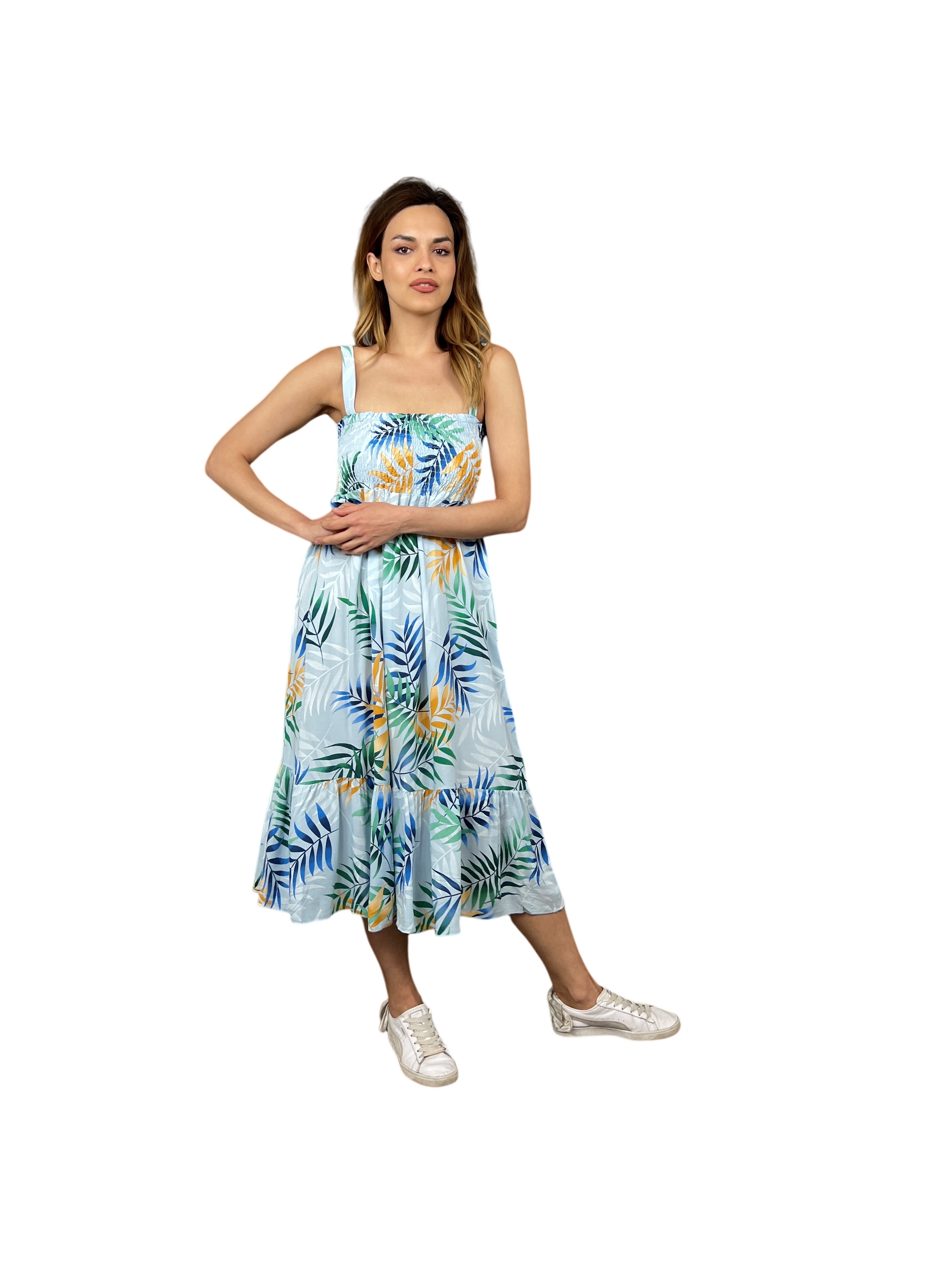 Představujeme dlouhé šaty Elora - nezbytný doplněk pro ženy, které se v letní sezóně zajímají o módu. Díky provedení bez rukávů a elastickému hrudníku vám budou pohodlně sedět, zatímco úžasný letní květinový potisk dodá vašemu outfitu nádech elegance. Krásné letní barvy jistě upoutají pozornost, ať už se vydáte kamkoli, a tyto šaty se tak hodí pro každou příležitost ať už vyrazíte na piknik nebo na pláž. Dlouhé šaty Elora jsou vyrobeny z vysoce kvalitních materiálů a jistě se stanou základem vašeho šatníku na dlouhá léta. Nenechte si ujít tyto elegantní a stylové šaty!