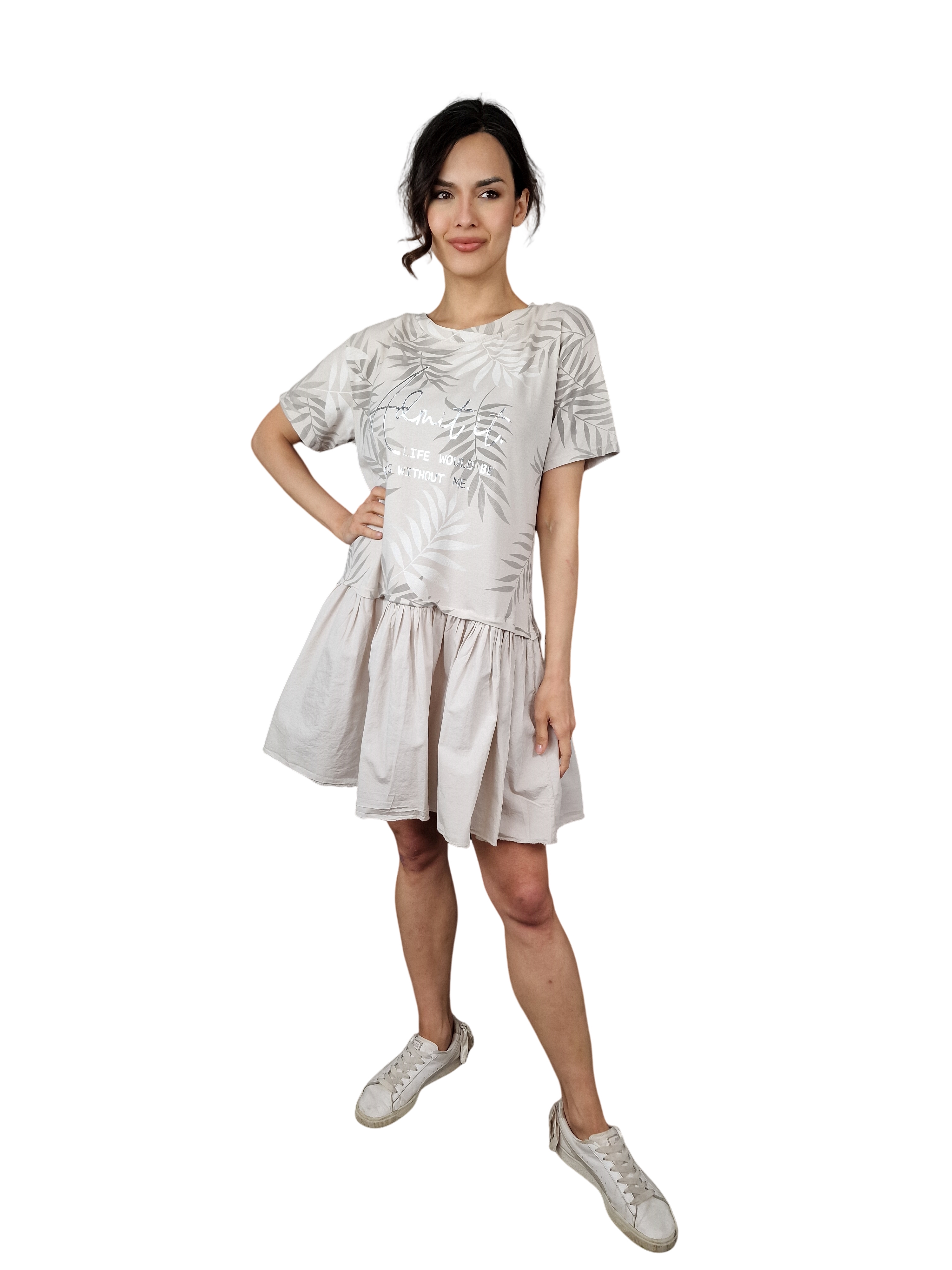 Od pasu dolů jsou šaty bez potisku, což vytváří harmonický a elegantní kontrast k bohatě zdobené vrchní části. Jednobarevná sukně zjednodušuje celkový vzhled a umožňuje snadné kombinování s různými doplňky a obuví. Tento minimalistický přístup zajišťuje, že šaty jsou univerzální a vhodné pro různé situace.