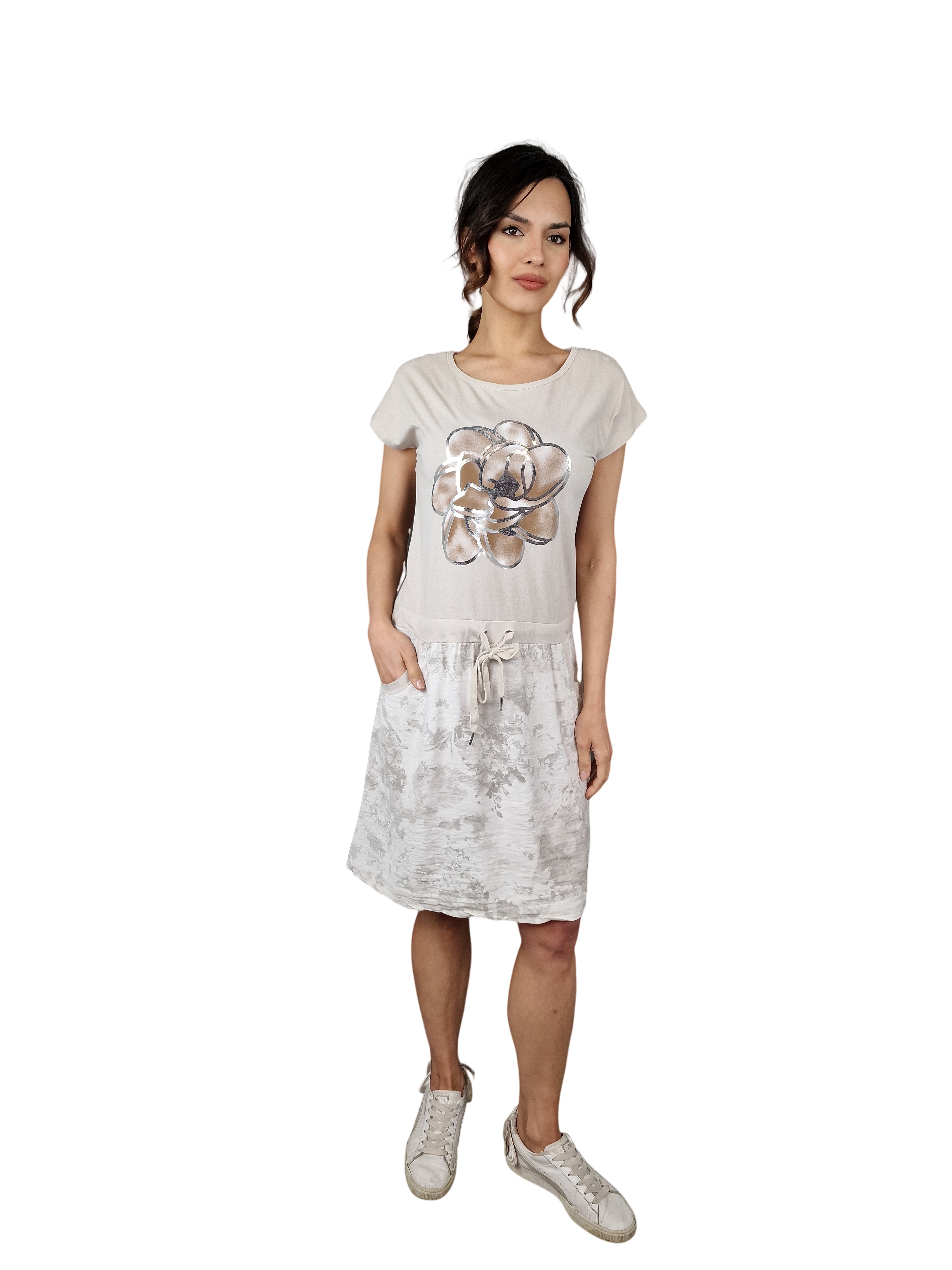 Horní část šatů zdobí jemný květinový potisk, který přidává na jejich romantickém a elegantním vzhledu. Květinový vzor je decentní, ale dostatečně výrazný na to, aby šaty působily svěže a přitažlivě. Tento designový prvek je ideální pro ty, kdo mají rádi přírodní motivy a chtějí ve svém šatníku kousek, který v sobě snoubí jemnost a styl.