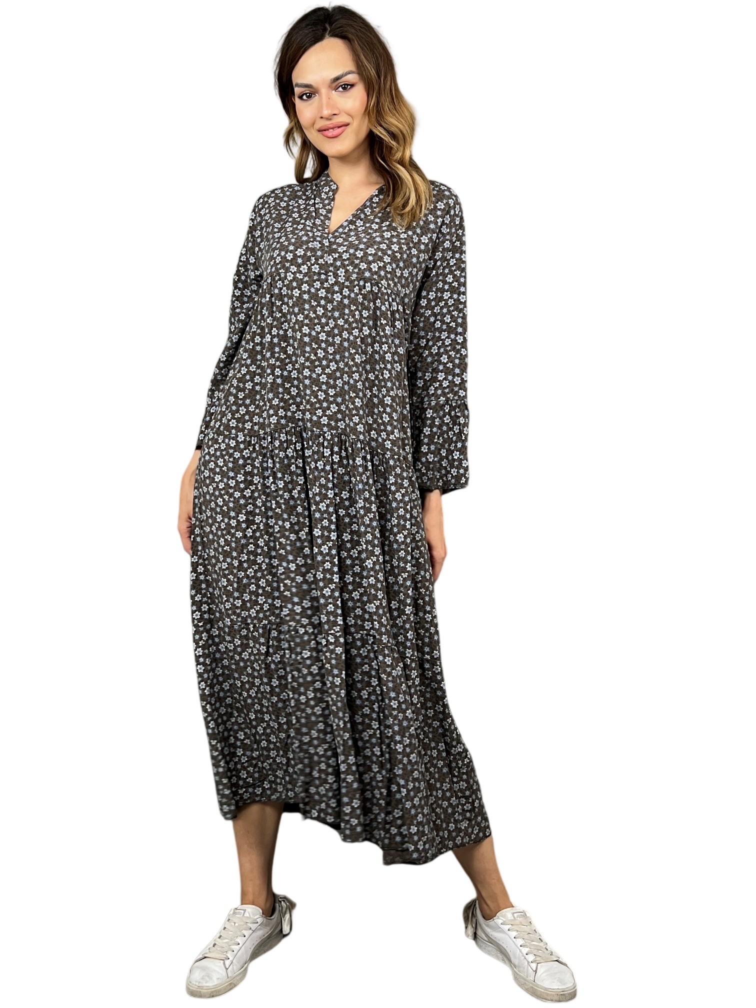 Představujeme dlouhé šaty Sienna, které musíte mít ve svém šatníku! Díky 3/4 rukávům a volnému střihu nabízejí tyto šaty ve volné velikosti jedinečné pohodlí a styl. Živý květinový potisk dodává šatům nádech ženskosti, zatímco detail s volánky je hravý. Ať už se chystáte na zahradní party nebo na neformální výlet, tyto dlouhé šaty se hodí pro každou příležitost. Připravte se na to, že se v dlouhých šatech Sienna budete otáčet a cítit se báječně. Nenechte si ujít tento vzrušující módní kousek.