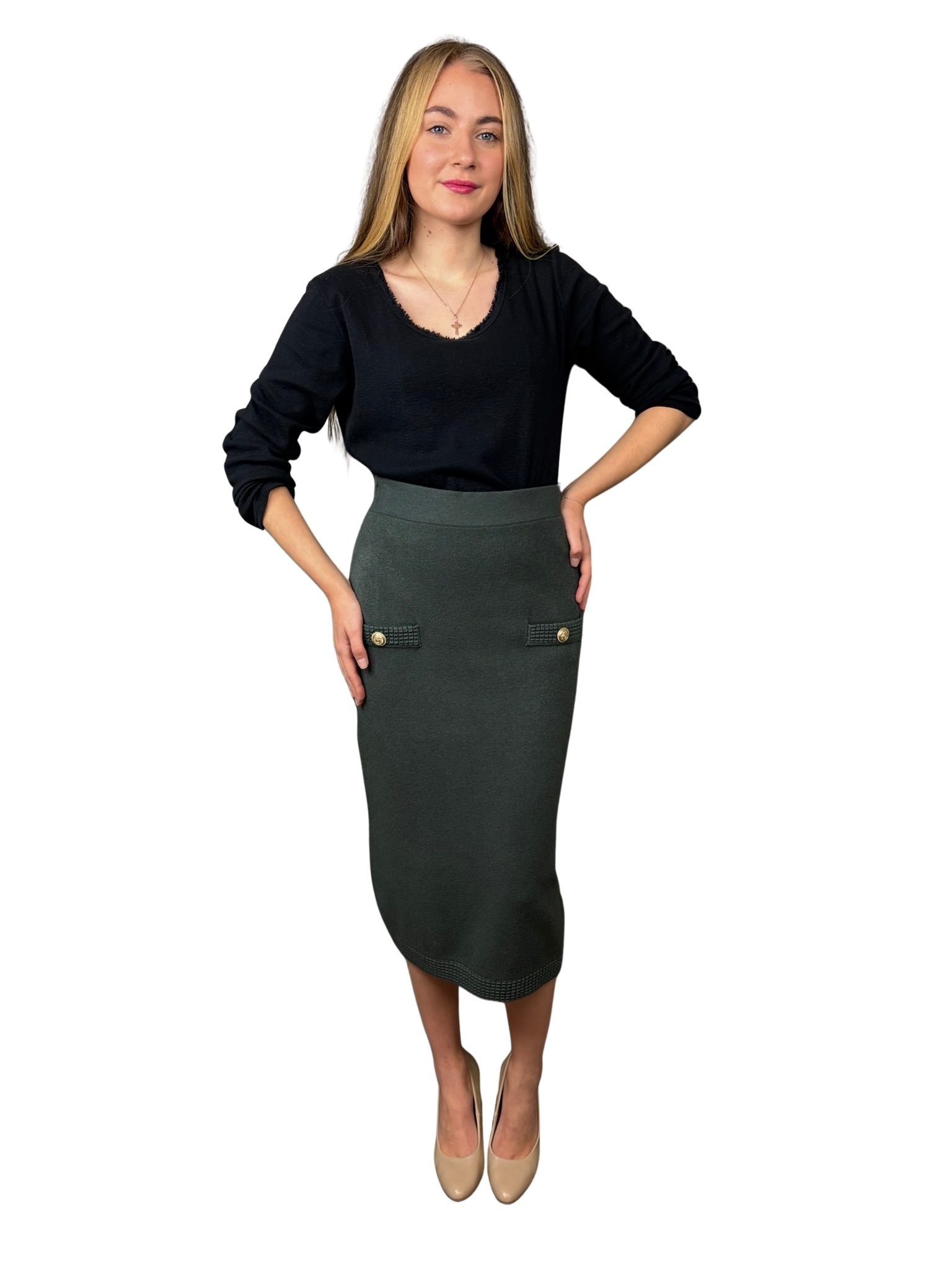 Sukně Noble je nadčasový kousek v midi délce, který působí elegantně, ale zároveň je příjemně pohodlný. Má čistý, hladký vzhled, pružný pas a rafinovaný detail dekorativních „kapes“ se zlatými knoflíky – díky tomu se hodí do práce, na schůzky i na společenské příležitosti.