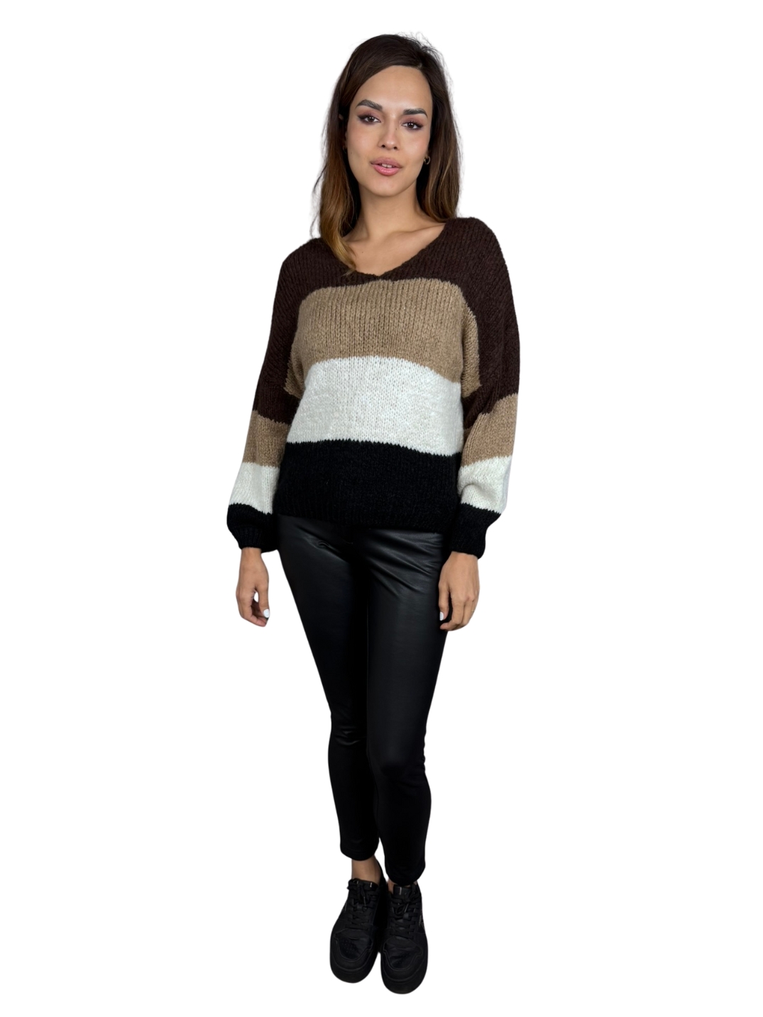 Výrazné barevné pruhy dodávají svetru originální vzhled a výstřih do V působí elegantně a lichotí dekoltu. Snadno jej zkombinuješ s džínami, legínami nebo sukní a vytvoříš tak ležérní i stylový outfit.