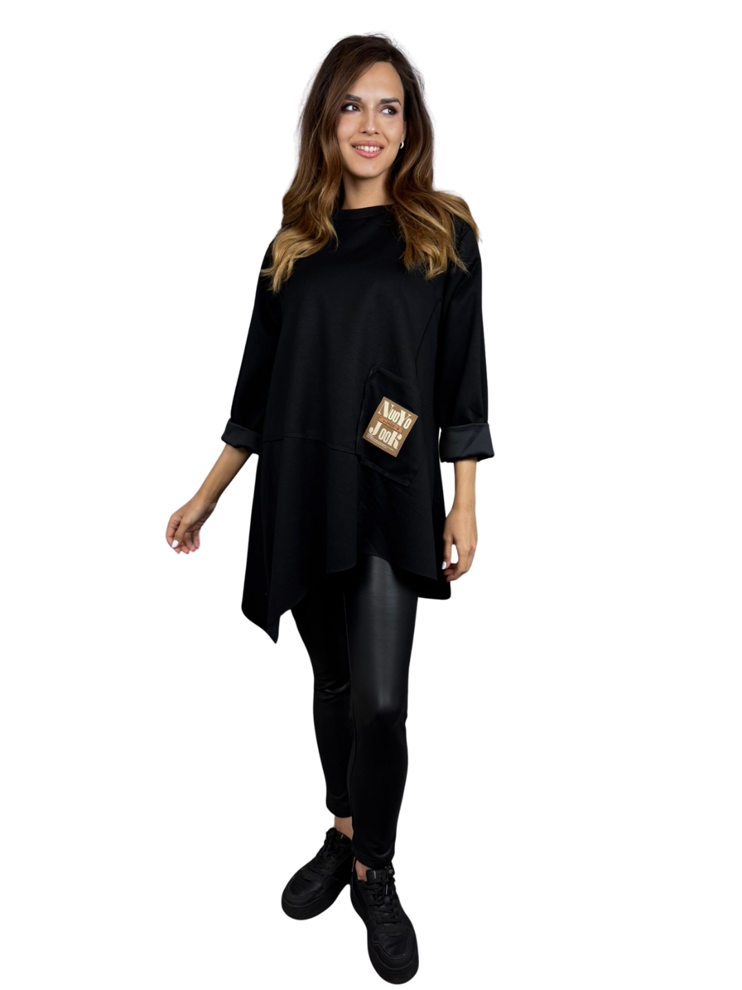 Přední kapsa s dekorativní nášivkou dodává tunice moderní nádech, zatímco 3/4 rukávy s možností ohrnutí zajišťují univerzální využití. Lze ji nosit k legínám, džínům i úzké sukni – vždy vytvoří elegantní a ležérní outfit.