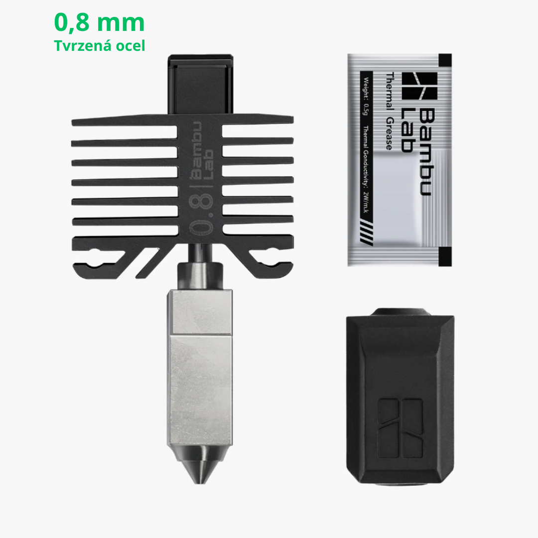 Hotend Bambu Lab se vyznačuje jedinečným designem „all-in-one“: heatsink, heatbreak, heaterblock a tryska jsou integrovány do jednoho kusu. Tento hotend z tvrzené oceli je vhodný pro tisk abrazivních materiálů (ESD, fireproof, uhlíková vlákna, skelná vlákna...). Kompatibilita s materiály 0.2 mm Tryska 0.4 mm Tryska 0.6 mm Tryska 0.8 mm Tryska PLA/Silk Ano Ano Ano Ano Wood/Metal PLA NE Ano Ano Ano PETG Ano Ano Ano Ano PVA Ano Ano Ano Ano ABS Ano Ano Ano Ano ASA Ano Ano Ano Ano ASA Ano Ano Ano Ano PC Ano Ano Ano Ano PA NE Ano Ano Ano TPU NE Ano Ano Ano PLA-CF NE Doporučeno Ano Ano PETG-CF NE Doporučeno Ano Ano PAHT-CF NE Ano Doporučeno Ano PET-CF NE Ano Doporučeno Ano