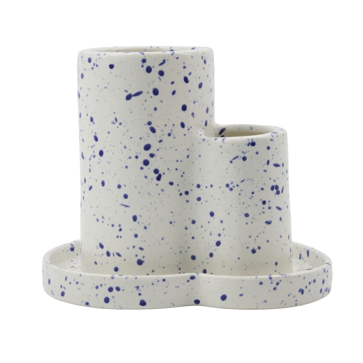 Je ručně vyrobený z kameniny a zdobí jej hravý modrý stříkaný dekor. Do dvou držáčků pohodlně uložíte psací a kreativní potřeby, nůžky, ale také vařečky, nebo zubní kartáčky v koupelně. Vše pak bude úhledně roztříděné.