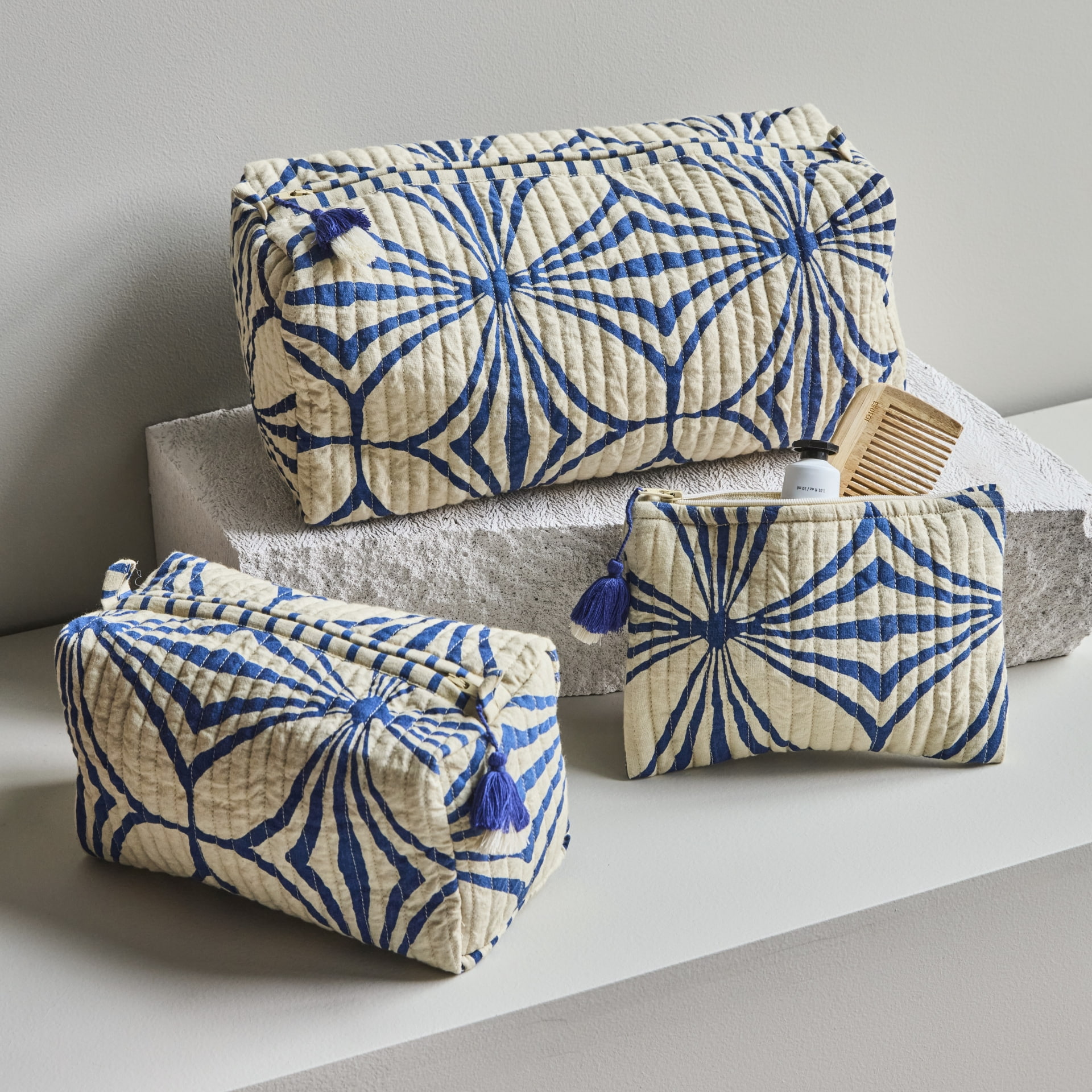 Taštičky jsou vyrobené z bavlny a mají prošívané provedení, které jim dodává měkkost i tvarovou stálost. Béžový podklad s kobaltově modrými ornamenty a modrými třásněmi působí nadčasově a dekorativně, takže set využijete nejen jako cestovní doplněk, ale i jako stylový úložný prvek v koupelně či ložnici. Velikost S: délka 18 cm / šířka 14 cm / hloubka 1 cm
