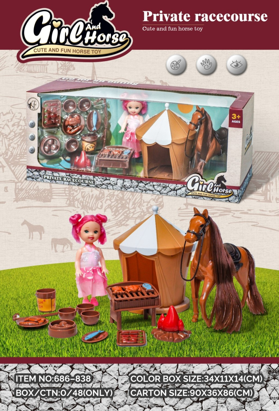 Hrací set obsahuje panenku, koníka a další doplňky.