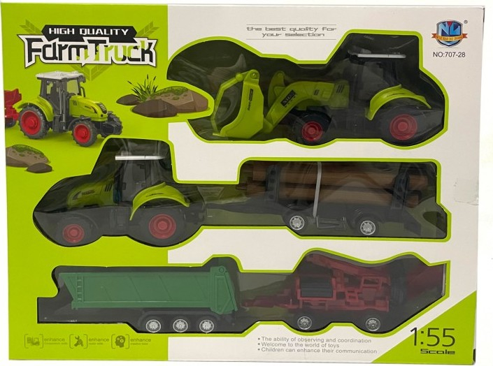 Set obsahuje traktor a valník k připojení a další doplňky.