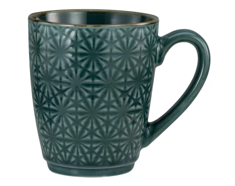 Hrnek o objemu 300 ml v petrolejové barvě s jemným vzorem je vyroben z kvalitní kameniny. Hrnek zaujme svým retro stylem a bude ideálním doplňkem pro každodenní pití kávy nebo čaje.