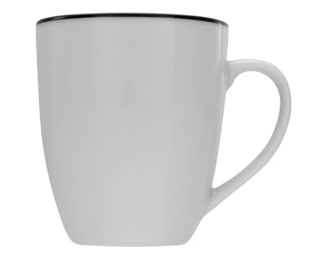 Hrnek o objemu 300 ml z bílého porcelánu s černým okrajem je vhodný na kávu a čaj. Díky univerzálnímu designu se hodí do jakékoli kuchyně.
