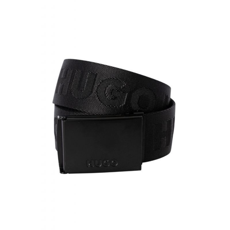 Vlastnosti: Barva: černá Logo HUGO Typ: Pánský neformální opasek Složení materiálu: 60 % polyuretan, 40 % polyester Šířka opasku: přibližně 3,5 cm Spona: klasická, kovová s matným povrchem Styl: ležérní, streetwear, smart-casual