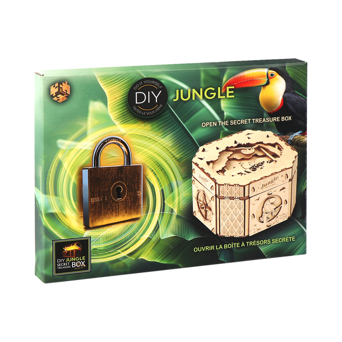 DIY hlavolam s motivy džungle se skrytou přihrádkou pro originální darování. Sestavte ho a darujte středně pokročilým milovníkům hlavolamů. Materiál: dřevo