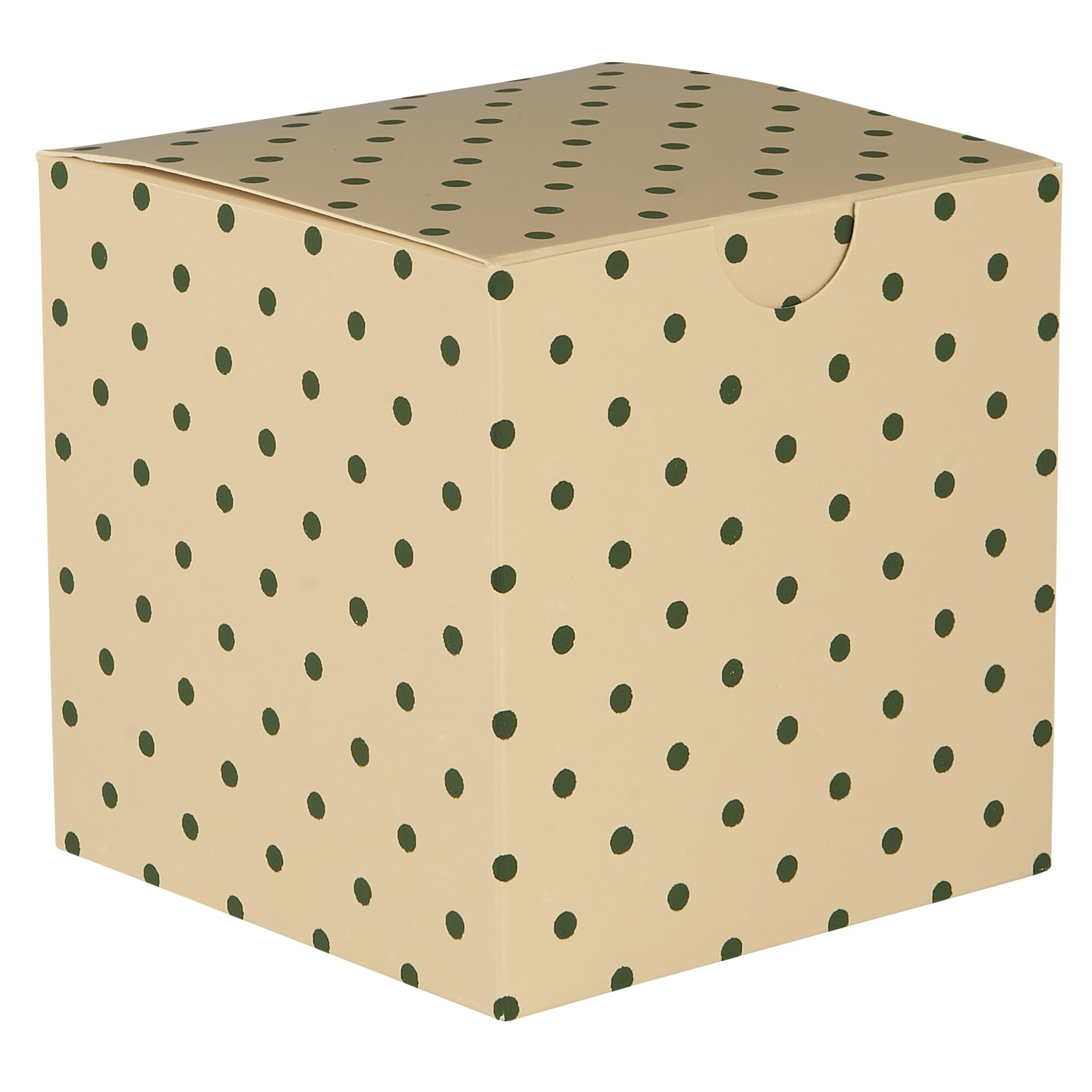 Vyrobená je z pevného kartonového papíru s motivem tmavě zelených puntíků, který je vhodný pro různé příležitosti. Krabičku si snadno složíte a dovnitř vložíte svůj dárek.