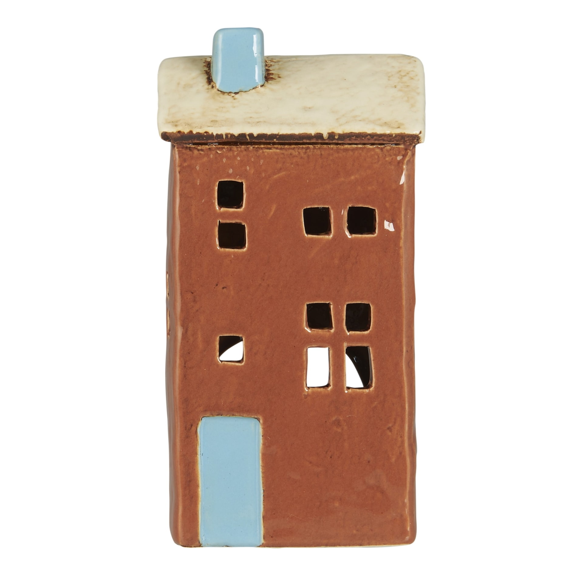 Keramický svícen od dánské značky Ib Laursen má jemné rysy, nedbalé linie a tím působí ještě laskavěji. Má červeno-hnědou fasádu, světlou střechu a výrazné dveře s komínem ve světle modrém odstínu.