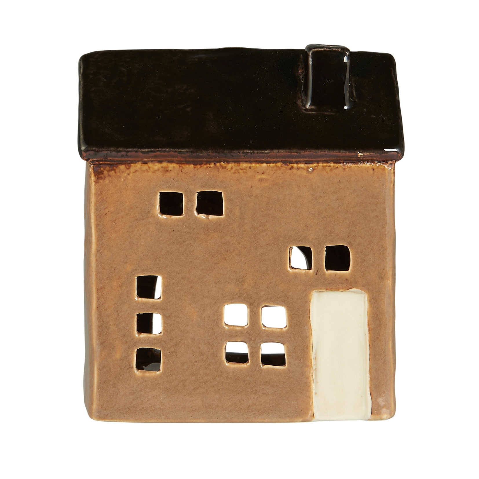 Keramický svícen od dánské značky Ib Laursen má jemné rysy, nedbalé linie a tím působí ještě laskavěji. Má světle béžovou fasádu, hnědou středu s komínem, dveře domečku jsou světlé, krémové.