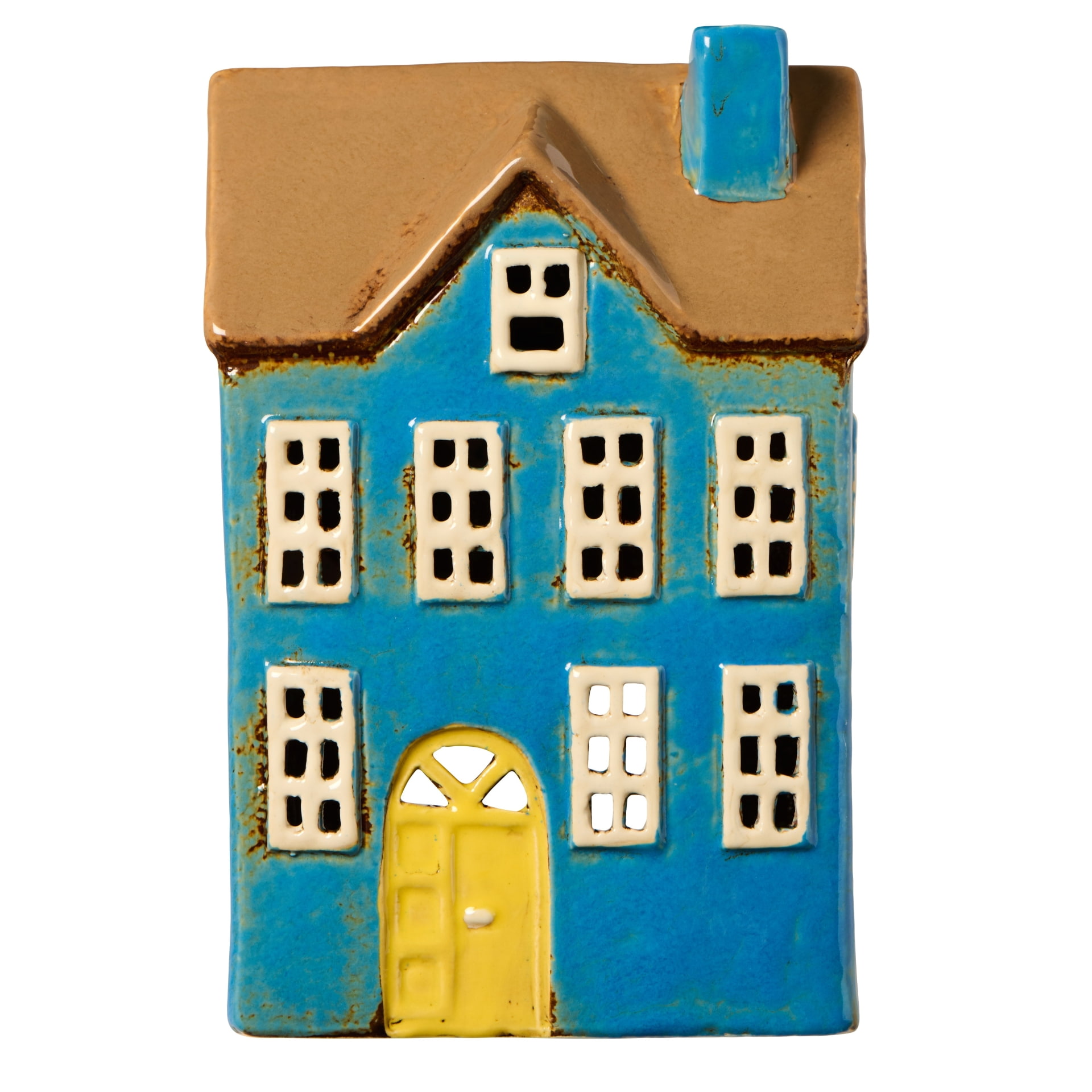 Ib Laursen Kameninový svícen Nyhavn Yellow Door, modrá barva, keramika. Tento vyšší keramický svícen ve tvaru domečku od dánské značky Ib Laursen s výraznými žlutými dveřmi je poctou ikonickému kodaňskému nábřeží Nyhavn.