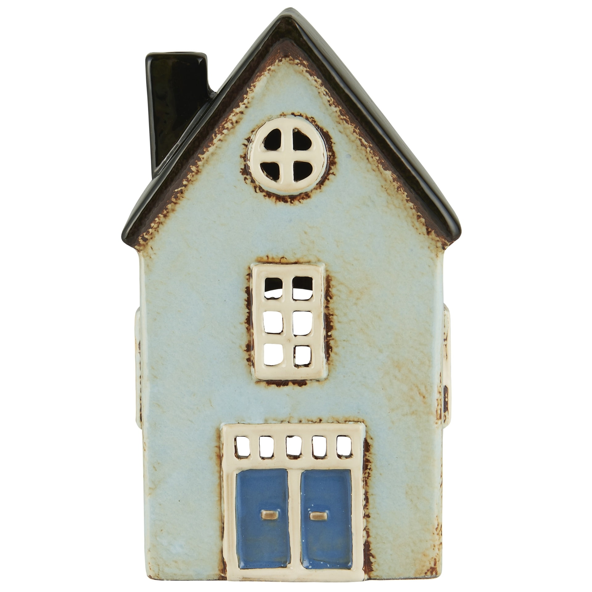 Keramický svícen od dánské značky Ib Laursen má světlě modrou fasádu, dvě okna nad sebou, dvojité dveře a tmavou střechu s komínem. Je určený pro čajovou svíčku, která se vkládá ze zadní strany domečku. Tlumené světlo svíčky pak krásně prosvítá vyřezávanými okýnky a vytváří tu nejpříjemnější atmosféru, na kterou se budete těšit večer co večer. výška 19 cm / šířka 11 cm / hloubka 8 cm Vyrobeno z keramiky.
