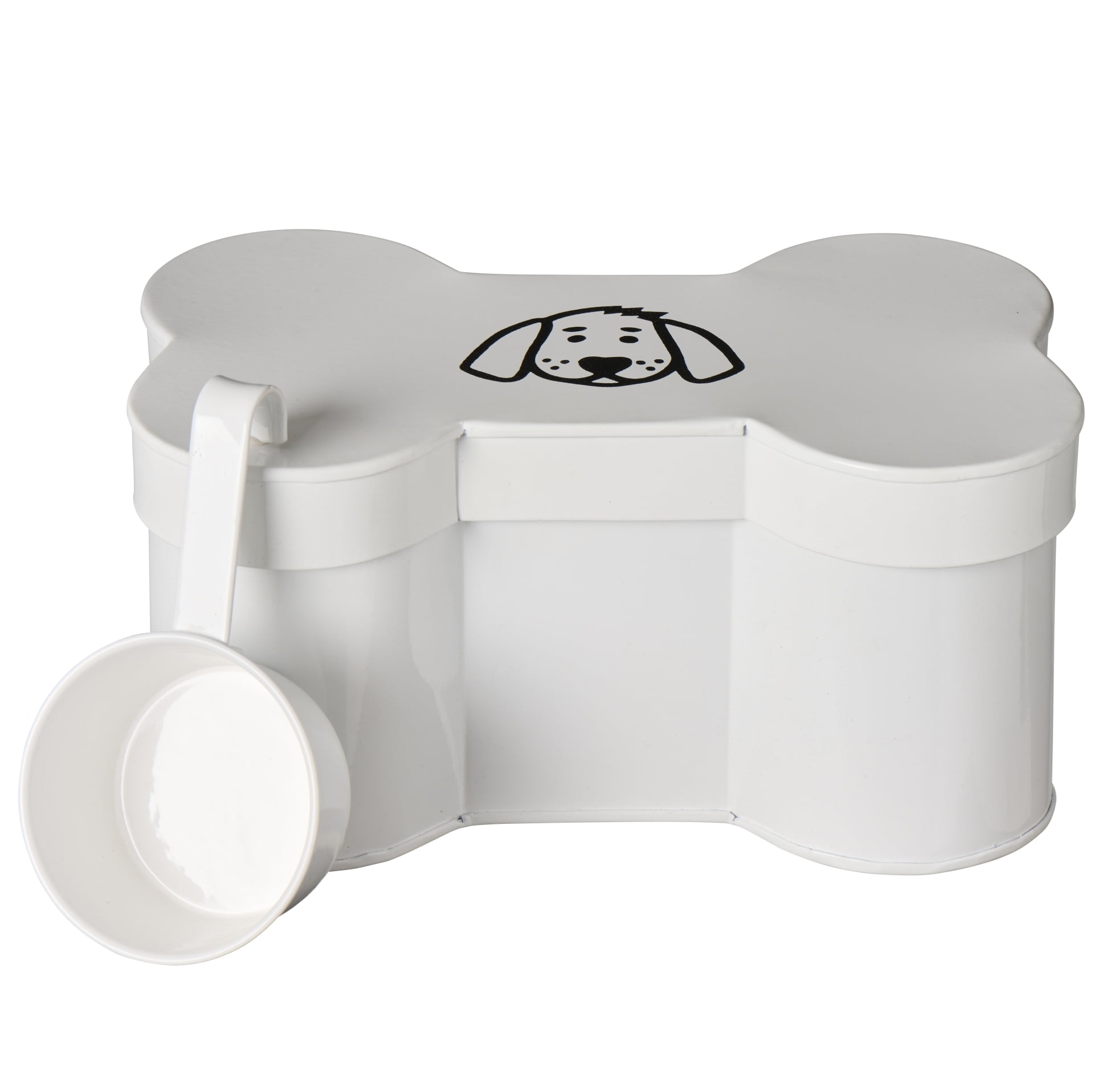 Tento plechový box s víkem je ve tvaru kosti a víko zdobí kresba pejska. Granulky můžete navíc rovnou nabrat přiloženou lopatkou a odměřit tak potřebné množství.