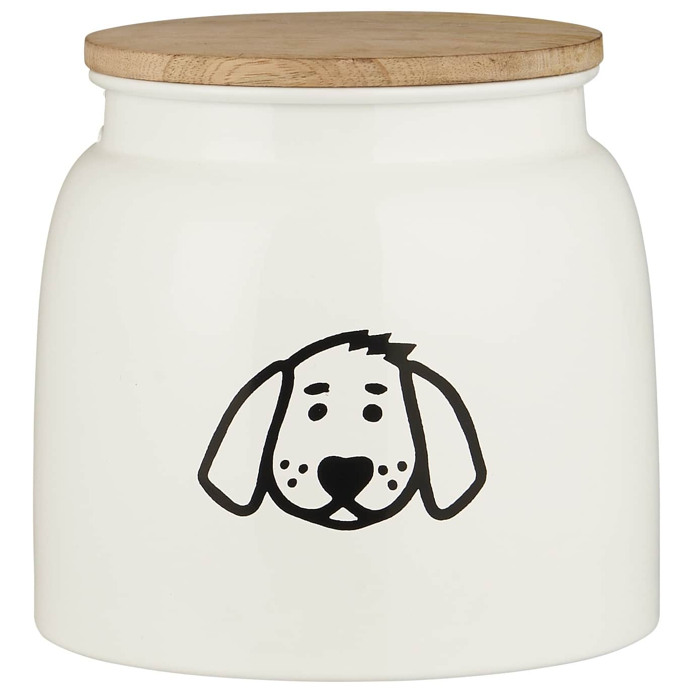 Plechová dóza má bílý odstín, který ze přední strany doplňuje rozkošný psí motiv, kreslený tenkou černou linkou. Dóza má kulatý půdorys a rovné stěny. Uzavírá se víčkem z mangového dřeva, jehož součástí je i silikonové těsnění uchovávající čerstvost granulí. objem 2,2 l / průměr 16 cm / výška 15,5 cm Vyrobeno z kovu, mangového dřeva.