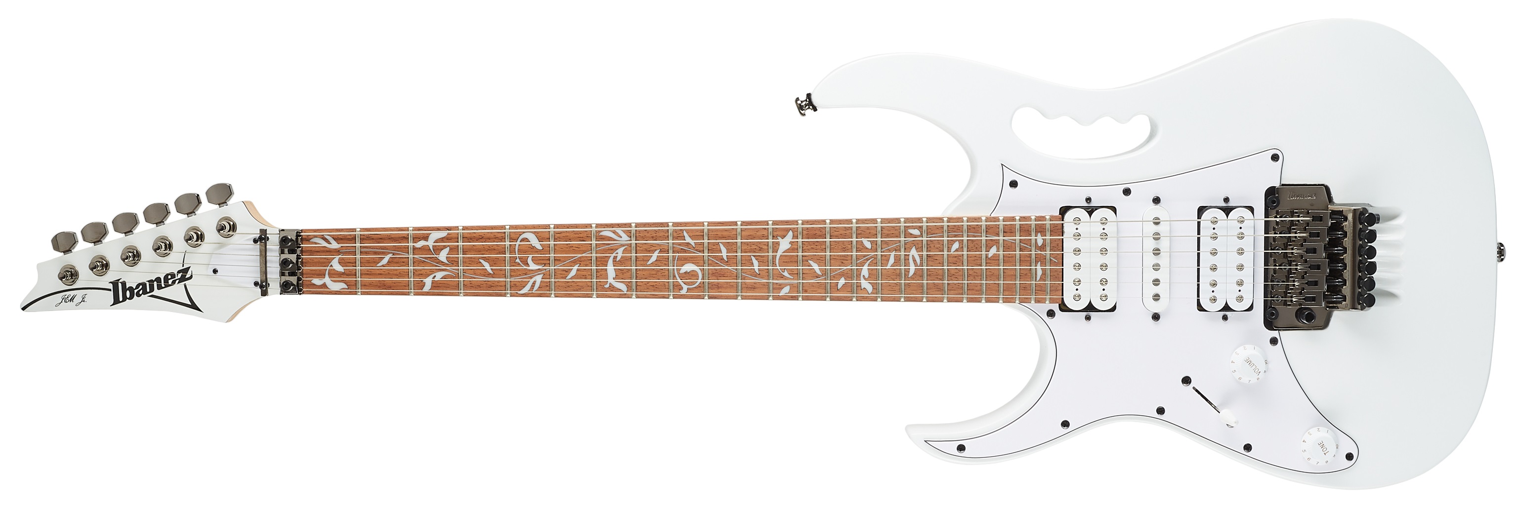 Levoruká elektrická kytara Elektrická kytara pro leváky JEMJRL White japonské značky Ibanez je signature modelem známého kytarového kouzelníka Steva Vaie. Disponuje jasnými poznávacími znaky v podobě výřezu v těle (monkey grip) a dekorativního inlaye hmatníku Tree-of-life, se kterými si okamžitě spojíte tuto osobnost. Tělo kytary je vyrobeno ze dřeva meranti. K javorovému krku s profilem Wizard III je přilepen hmatník ze dřeva jatoba osazený čtyřiadvaceti p