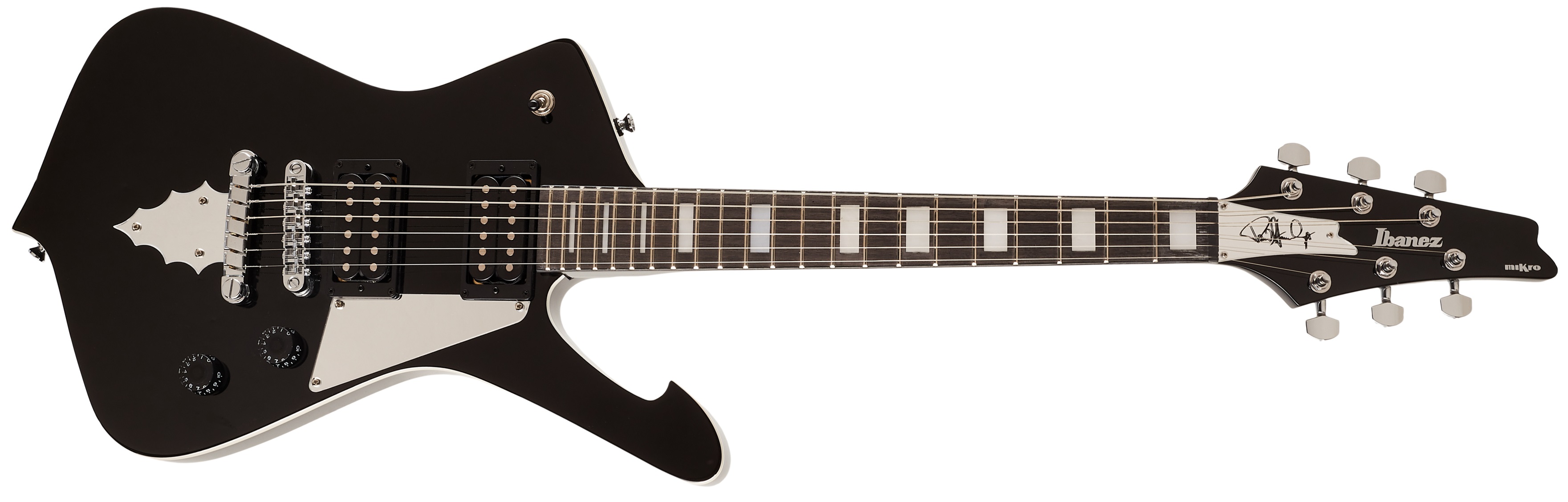 Elektrická kytara Kytary ze série Mikro jsou díky kompaktním rozměrům vhodné především pro začínající dětské rockery a rockerky, ale jistě je ocení i milovníci kvalitní zábavy. Kytara PSM10 Black se totiž snadno může stát ozdobou jakéhokoliv večírku. Jde o zmenšenou verzi signature modelu Paula Stanleyho z Kiss. Tělo nástroje je zhotoveno z topolu. Ke krátkému javorovému krku je přilepen ebenový hmatník osazený dvaadvaceti pražci. Orientaci na hmatníku usnadňují polohové bloky. Dva pasivní humbuckery Infini