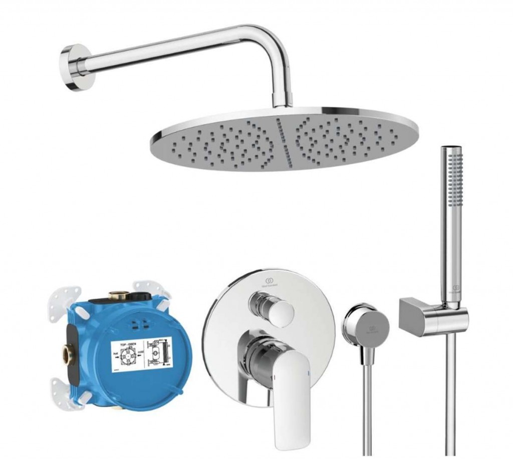 Sprchový set Connect Air obsahuje Pákovou baterii pod omítku barva: chrom materiál: kov rozeta průměr 163 mm SmartShine povrchová úprava pákové ovládání s automatickým přepínačem CLICK - kartuše průměr 47 mm s keramickými disky pivot kartuše z nerez oceli integrovaný omezovač teplé vody DICHT-FIX - těsnící systém montáž na montážní těleso Montážní těleso Easy-Box pro sprchové a vanové baterie pod omítku pro předmontáž pro vanové, sprchové a termostatické baterie pro všechny typy montáže - montáž do stěny, na stěnu, před stěnu a montáž na podpěrné systémy 4 úchytné nástavce s upevňovacím systémem FAST-FIX přečnívající přípojky G1/2 proplachovací díl těsnicí kroužek montážní návod montáž přímo nebo s nastavitelnou výškou celková hloubka 73 - 95 mm nastavitelná hloubka 5 - 40 mm podomítkový díl EASY-Box je použitelný pouze v kombinaci s dílem podomítkových baterií Sprchové rameno Idealrain barva: chrom materiál: kov délka: 300 mm připojení G 1/2 montáž na stěnu Hlavovou sprchu Idealrain barva: chrom materiál: kov průměr hlavice: 303 mm průtok při 3 barech 12 l/min s povrchovou úpravu pro snadnou údržbu SmartShine snadné čištění trysek závit G 1/2 Nástěnné sprchové koleno barva: chrom materiál: kov kruhová rozeta rozměr: 64 x 60 x 64 mm připojovací závit a připojení do zdi G 1/2 Držák ruční sprchy barva: chrom materiál: kov otočný skryté upevnění montáž na stěnu s povrchovou úpravu pro snadnou údržbu SmartShine Sprchovou hadici Idealflex barva: chrom délka: 1750 mm hladký povrch odolná proti zlomení připojovací závit G 1/2 Ruční tyčovou sprchu barva: chrom materiál: kov délka hlavice: 198 mm průměr hlavice: 25 mm velikost závitu G 1/2 1 normální proud, bez přepínače max. spotřeba vody 8 l/min. s povrchovou úpravu pro snadnou údržbu SmartShine