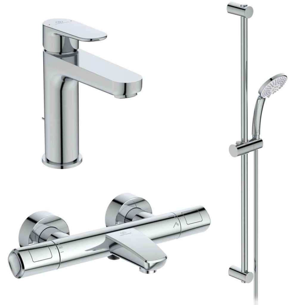 Set CeraTherm T100 obsahuje: Termostatickou nástěnnou vanovou baterie Ceratherm barva: chrom termostatická kartuše s omezovačem teploty na 40°C výtok 161 mm kovové ovládací rukojeti zamezení proti zpětnému toku S-přípojky s integrovaným přepínačem vana/sprcha dětská pojistka Cool Body technologie pro bezpečný dotyk Set ruční sprchy, hadice a tyče ruční sprcha - průměr 100 mm 3 proudy - déšť / jemný déšť / masážní sprchová tyč - délka 903 mm s posuvným držákem sprchy sprchová hadice - délka 1750 mm SmartShine povrchová úprava průtok 8 l/min (při 3 barech) Pákovou umyvadlovou baterii barva: chrom materiál: mosaz SmartShine povrchová úprava s odtokovou soupravou stojánková instalace komfortní zóna 122 mm výtok 125 mm kovová páka se značením teplé a studené vody FirmaFlow keramická kartuše 28 mm EasyFix jednoduchý a rychlý upevňovací systém integrovaný omezovač teploty horké vody průtok 3,8 l/min (při 3 barech) flexibilní hadice G3/8"