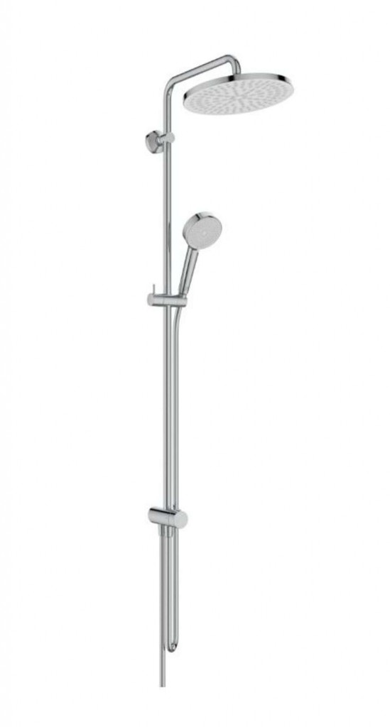 Sprchový systém pro kombinaci s nástěnnou baterií T25N obsahuje: sprchový set bez baterie barva: chrom dvoucestný keramický přepínač mezi hlavovou a ruční sprchou hlavovou sprchu Idealrain: barva: chrom materiál: plast průměr: 260 mm 1 proud: déšť průtok: 12 l/min při 3 barech ruční sprchu Idealrain: barva: chrom 2 proudy: Rain / SilkRain materiál: plast průměr: 100 mm průtok: 8 l/min při 3 barech připojení: G 1/2 2x sprchovou hadici Idealflex: hladký plastový povrch délka: 1 750 mm a 800 mm ochrana proti překrouceni sprchovou tyč: barva: chrom průměr: 21 mm výška: 1119 mm nastavitelný držák Ilustrační foto