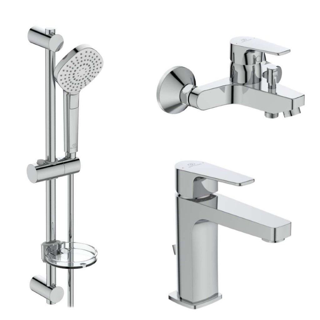 Set Esla obsahuje: Nástěnnou vanovou baterii Esla barva: chrom materiál: mosaz povrchová úprava SmartShine nástěnná instalace s přepínačem vana/sprcha výtok 161 mm rozteč 150±13 kruhové krycí rozety max. průtok 20 l/min (při 3 bar) Umyvadlovou baterii s výpustí Esla barva: chrom materiál: mosaz povrchová úprava SmartShine EasyFix jednoduchý a rychlý upevňovací systém s odtokovou soupravou, ovládání táhlem stojánková instalace komfortní zóna 104 mm výtok 120 mm výška 160 mm flexibilní hadice G3/8" max. průtok 5 l/min (při 3 bar) Set sprchové hlavice, tyče a hadice Idealrain Evo ruční sprcha - průměr 115 mm 3 druhy proudu: déšť, masážní proud, jemný déšť přepínání proudů stisknutím tlačítka sprchová tyč - délka 603 mm, rozteč uchycení max. 565 mm s posuvným držákem sprchy sprchová hadice - délka 1750 mm SmartShine povrchová úprava max. průtok 8 l/min (při 3 bar)