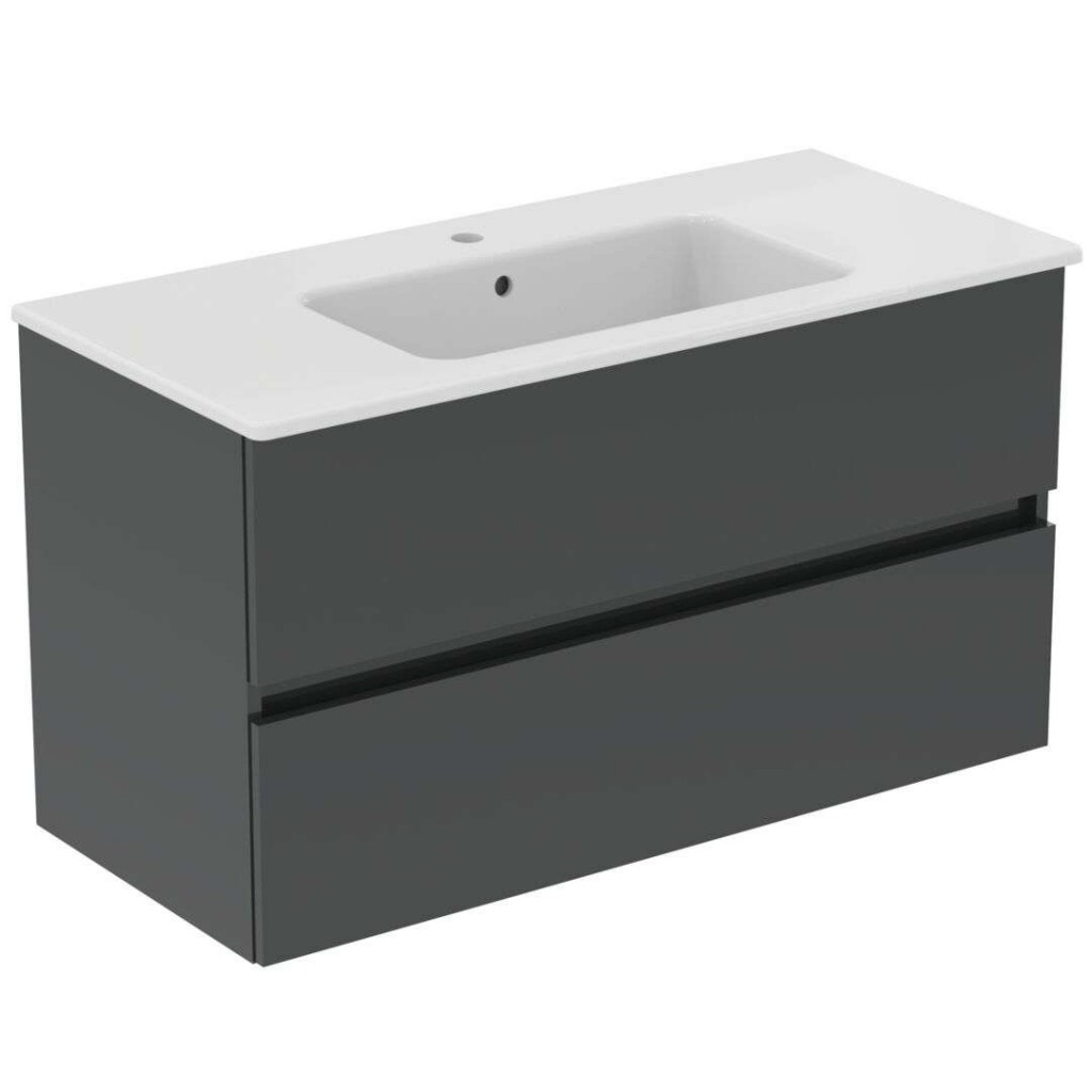 Nástěnná skříňka s umyvadlem Eurovit barva skříňky: tmavě šedá (lesklá) materiál skříňky: MFC rozměr skříňky: 550 x 1000 x 440 mm (VxŠxH) 2x zásuvka systém tichého dovírání Soft Close instalace zavěšením na zeď dodáváno smontované barva umyvadla: bílá materiál umyvadla: sanitární keramika rozměr umyvadla: 175 x 1015 x 465 mm (VxŠxH) 1 otvor pro baterii s přepadem s odkládací plochou