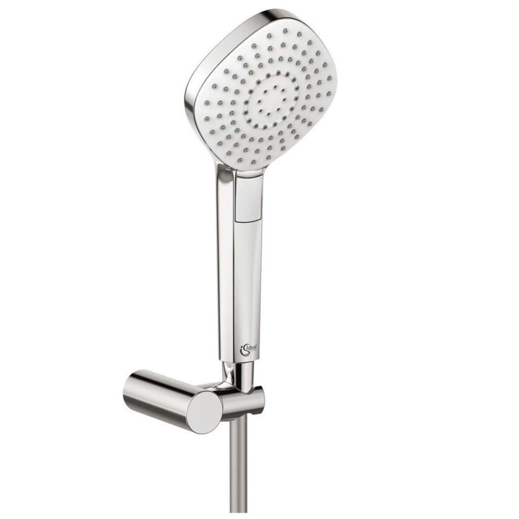 Idealrain Evo Diamond sprchová kombinace hranaté ruční sprchy s otočným držákem průměr hlavice 115 mm průtok při 3 barech 8 l/min 3 druhy proudu: déšť, masážní proud, jemný déšť přepínání proudů stisknutím tlačítka funkce Anti-Kalk zamezuje ukládání vodního kamene připojovací závit G1/2 povrchová úprava: chrom sprchové hadice IdealFlex délka 1250 mm provedení plast, stříbrná barva připojovací závit G1/2