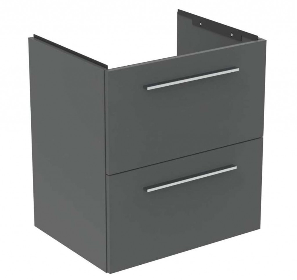 Skříňka pod umyvadlo Barva: šedý křemen matný (NG) Materiál: MFC / MDF Rozměry: 580 x 630 x 440 mm Instalace na stěnu Systém pro pomalé zavírání zásuvek 2 zásuvky – plně výsuvné PVD úprava povrchu Prostorově úsporný design Skříňka je dodávána smontovaná Vyrobeno ze dřeva z udržitelných zdrojů Výsuvný mechanismus: zatažením Upevňovací sada je součástí balení Madla nejsou součástí dodávky Ilustrační foto