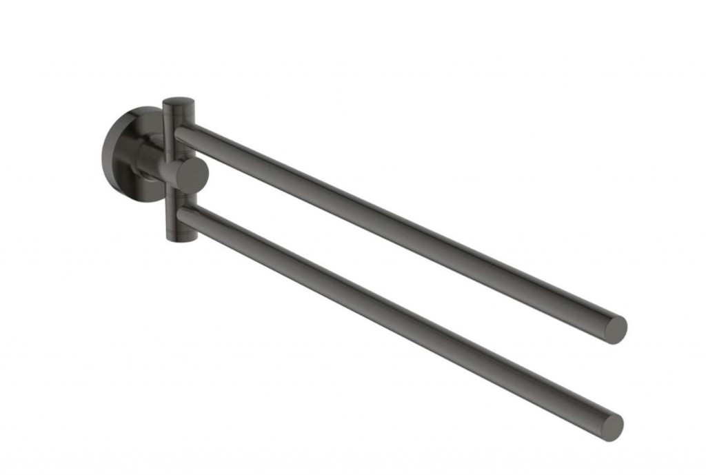 Dvojitý držák na ručníky barva: Magnetic Grey materiál: kov nástěnná montáž celková délka 370 mm kulatá krycí rozeta, průměr 48 mm 2 otočná ramena 2 skryté upevňovací prvky včetně upevňovací sady