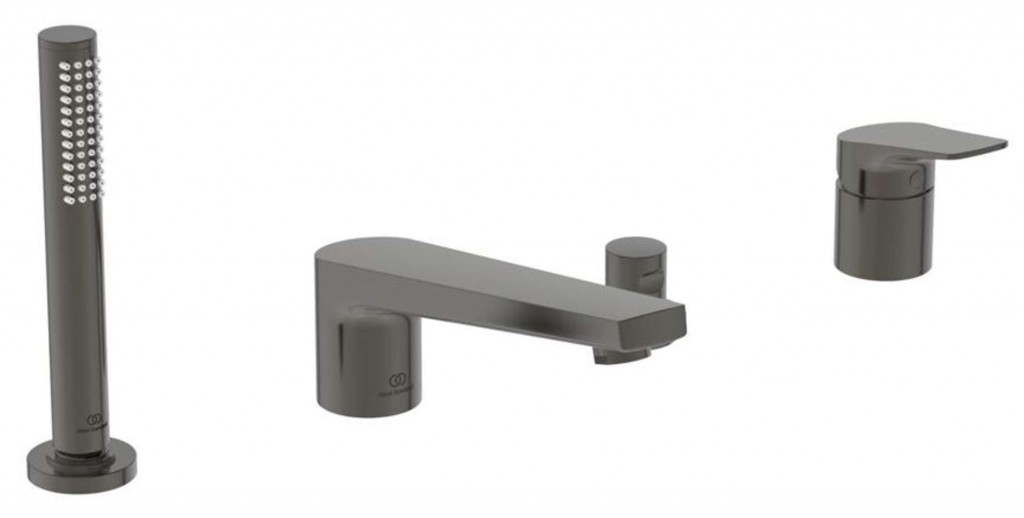 Páková vanová baterie provedení Magnetic Grey materiál mosaz povrchová úprava SmartShine - pro snadnější čištění 4-otvorová instalace montáž na okraj vany automatický přepínač litý vývod, délka 243 mm perlátor M24x1 kruhové krycí rozety, průměr 48 mm kovová páka bez označení studená / teplá technologie Click s mechanickou zarážkou snižující proud vody FirmaFlow keramická kartuše 38 mm připojení G 1/2" tyčová ruční sprcha - 1 proud sprchová hadice Idealflex - délka 175 cm