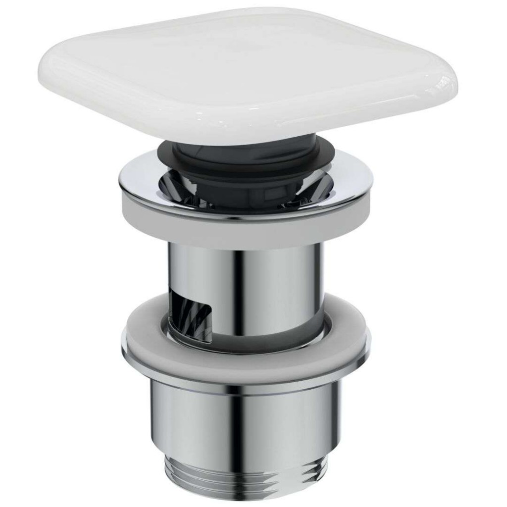 Výpust Click-Clack 85 x 85 mm barva zátky: lesklá bílá materiál: kov Systém Click-Clack - automatické zavírání a otevírání odpadu stlačením zátky